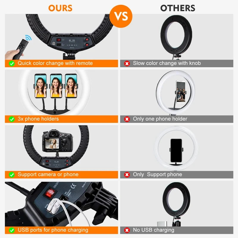 【18 inch Large Ring Light】Special LED SMD design give off great light (ranging from 2900K to 6500K color temperature without change the color filter, 10%-100% brightness adjustable), bright enough, perfect for portraits, vlog, livestream and selfie. Equipped with 100-240V global voltage.