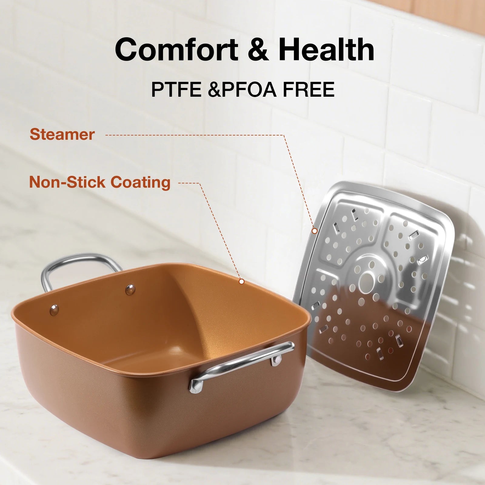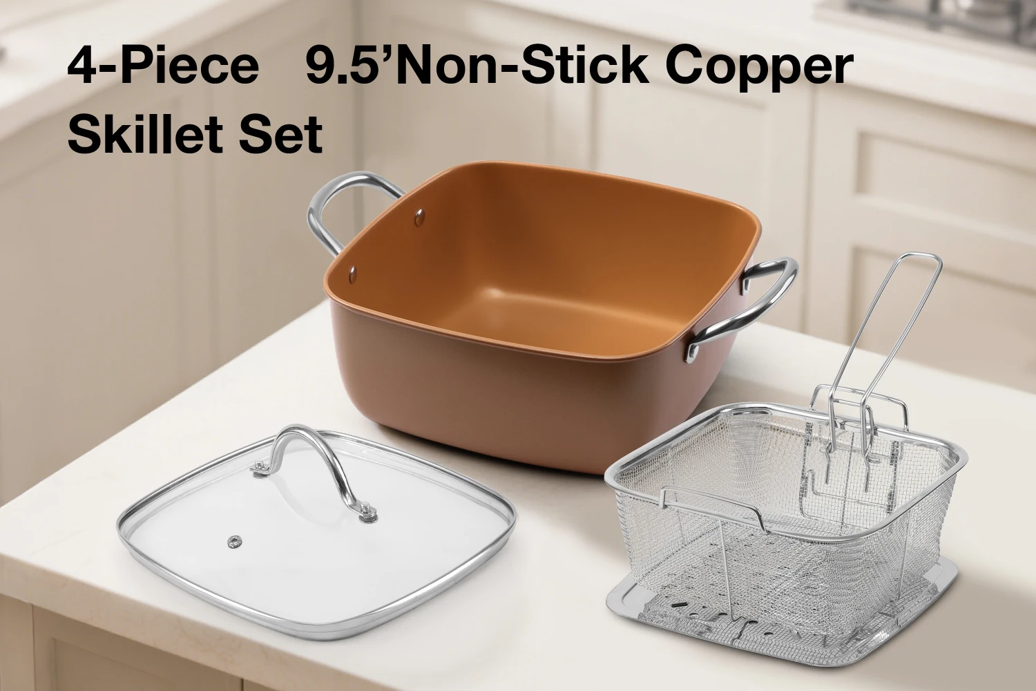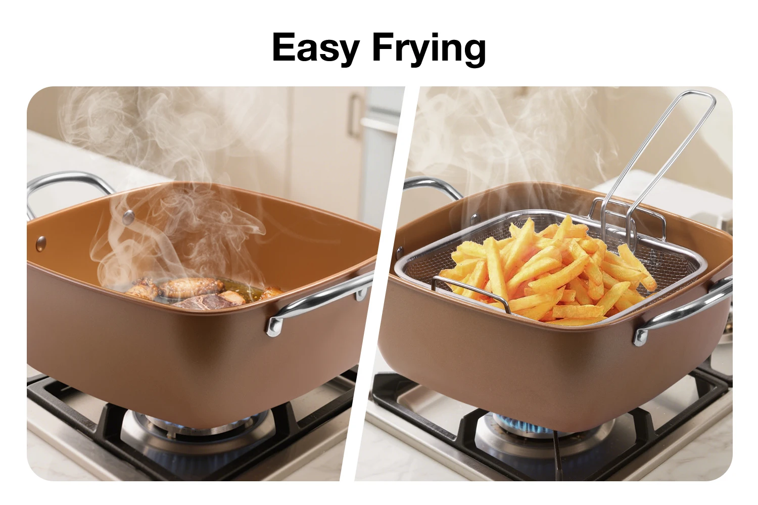 9.5” Non Stick Deep Frying Pan with Fry Basket Steamer Rack and Glass Lid Multi-Large Cooking Pan Stove Suitable Dishwasher Safe