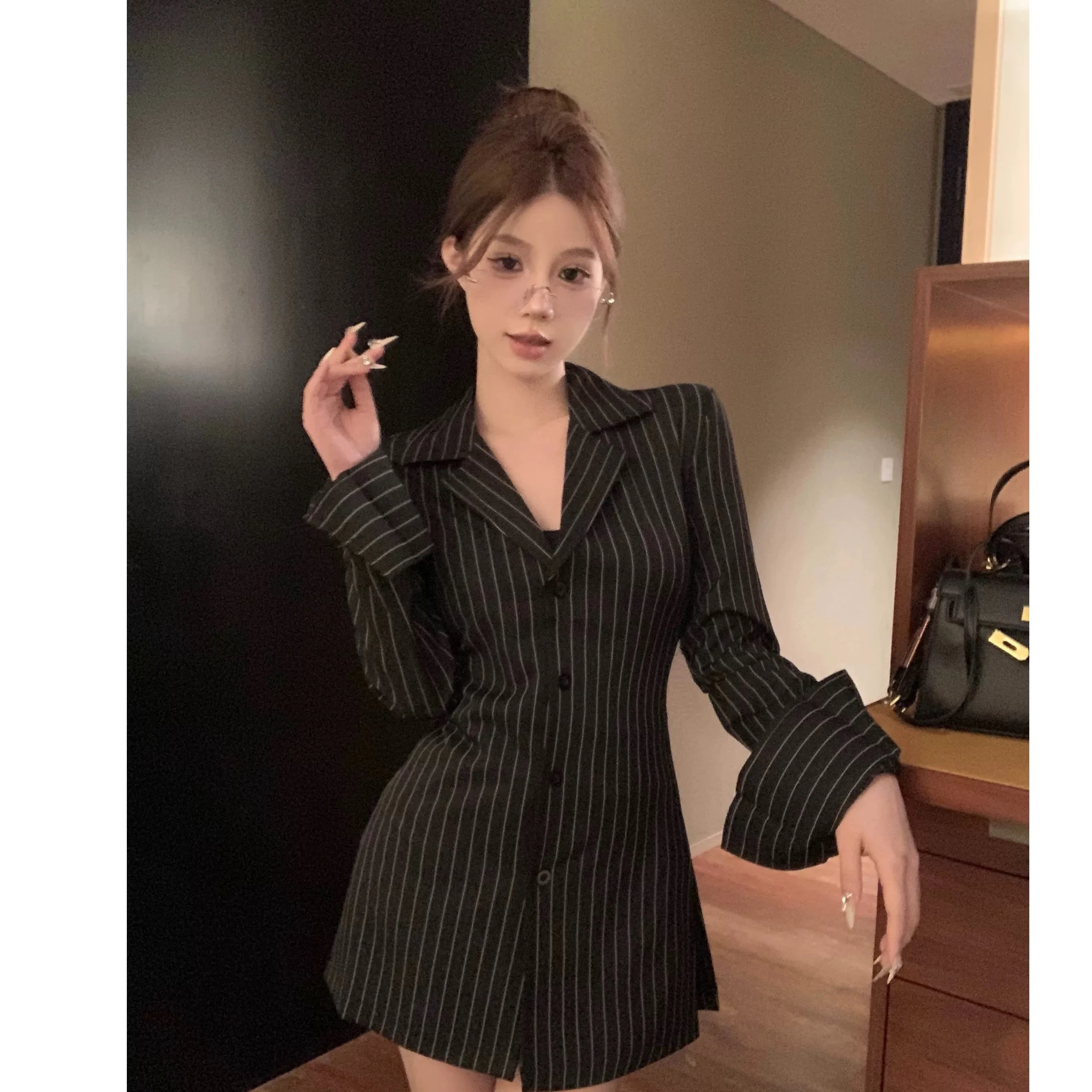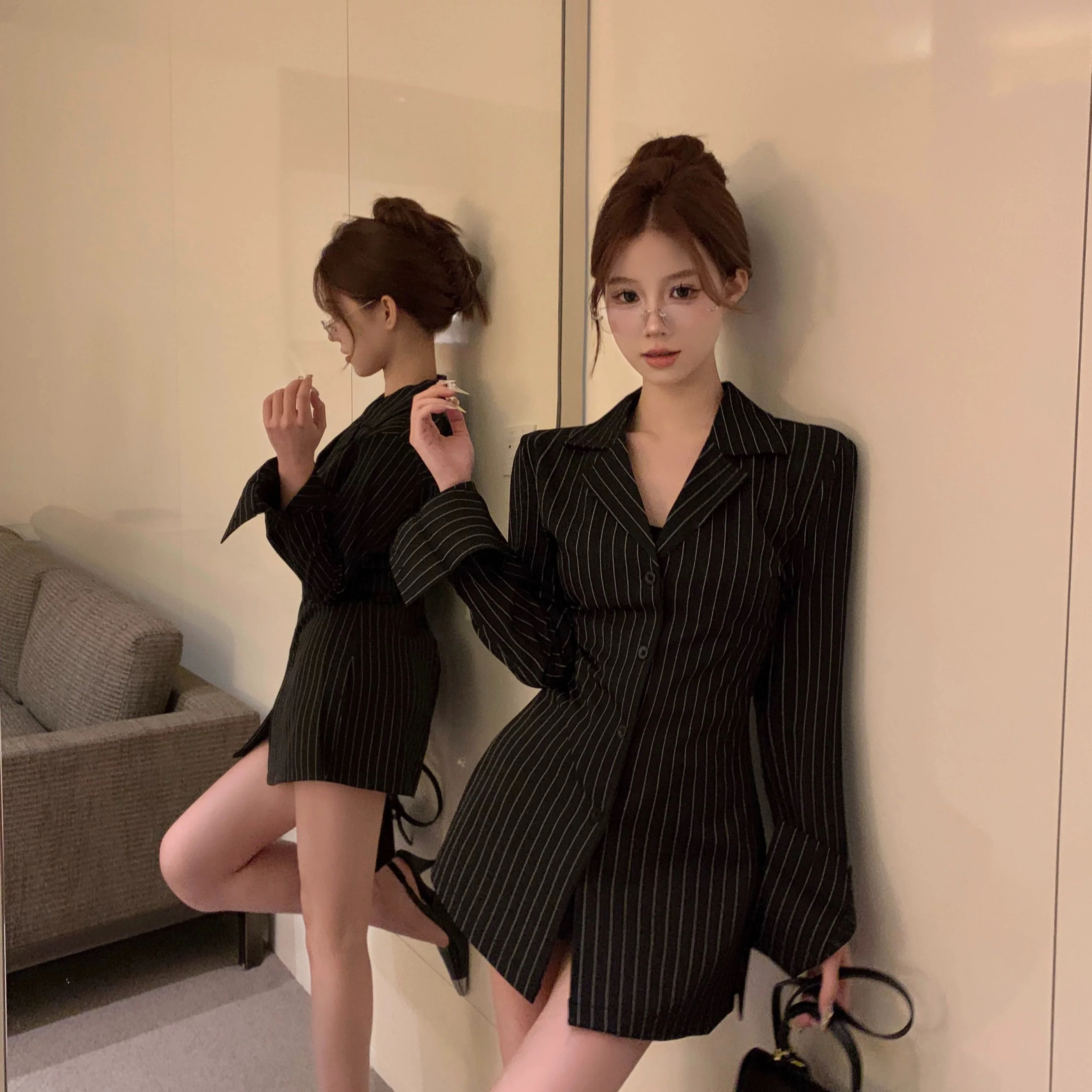 Bla Stripe Long Sve irt Autumn New Sle Ele Slim Fit V Ne Waist Cinched Midi Length Top for Women Sweet Sle