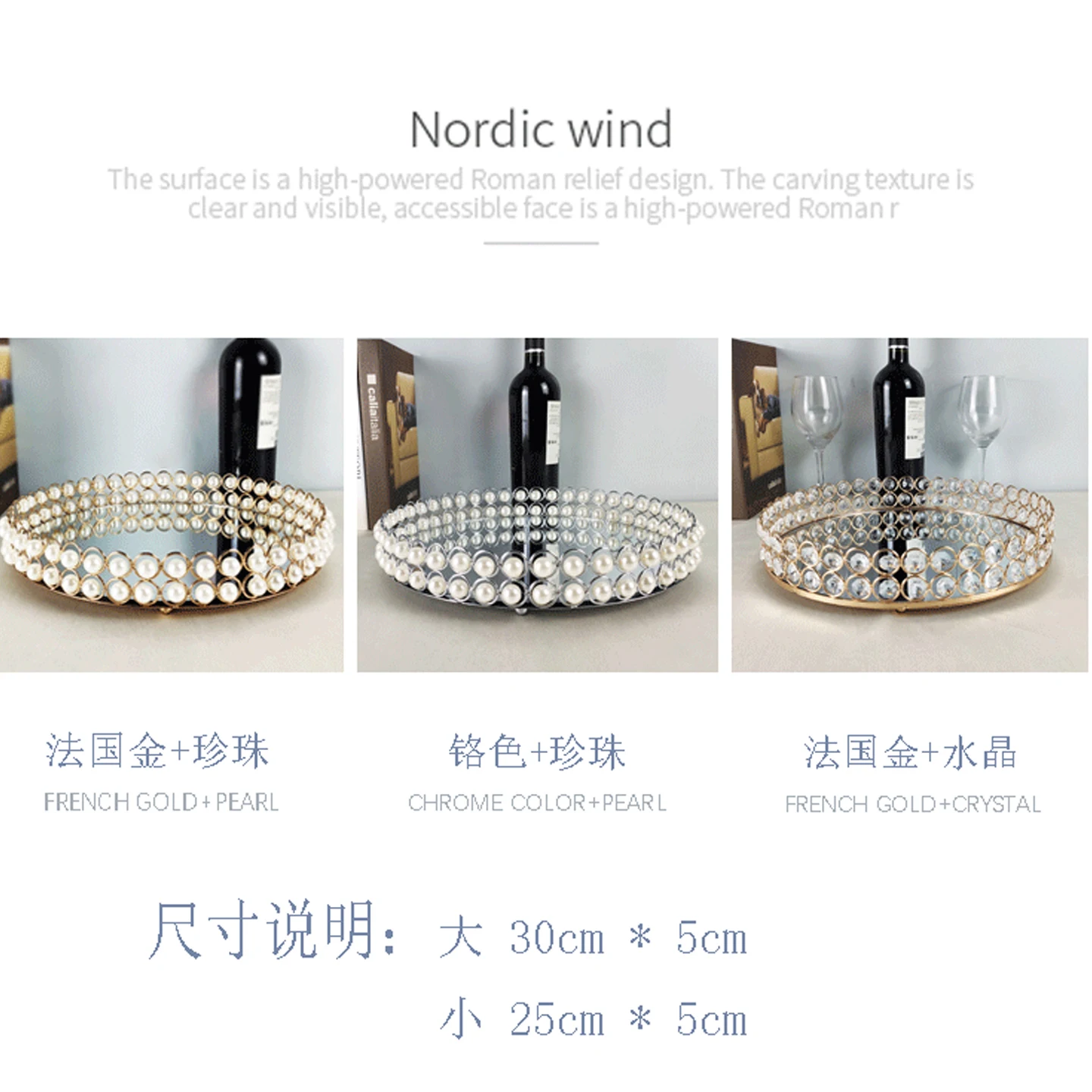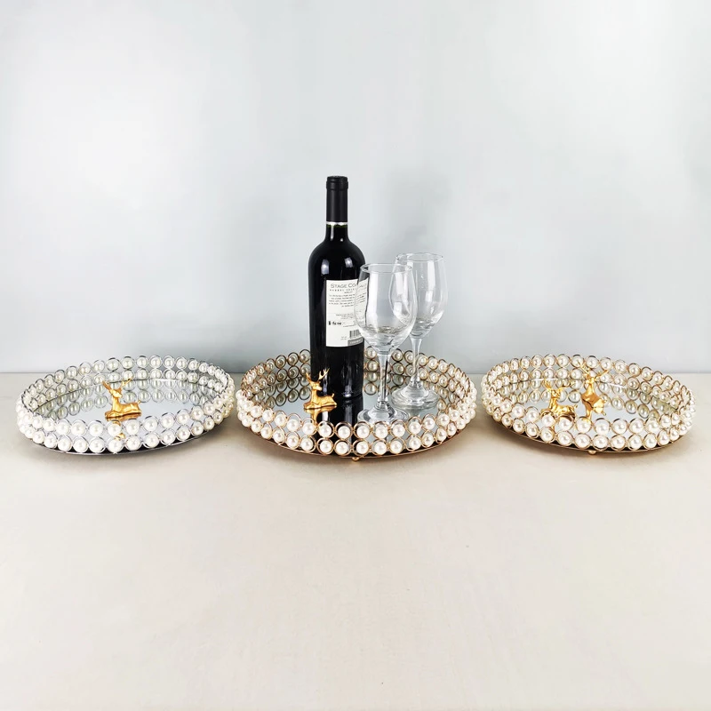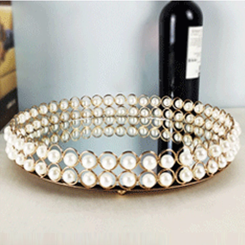 European Pearl-edged Glass Tray Ornaments Cosmetic Mirror Storage Tray Wedding Props Mirror Cake Rack Round Glass Plate