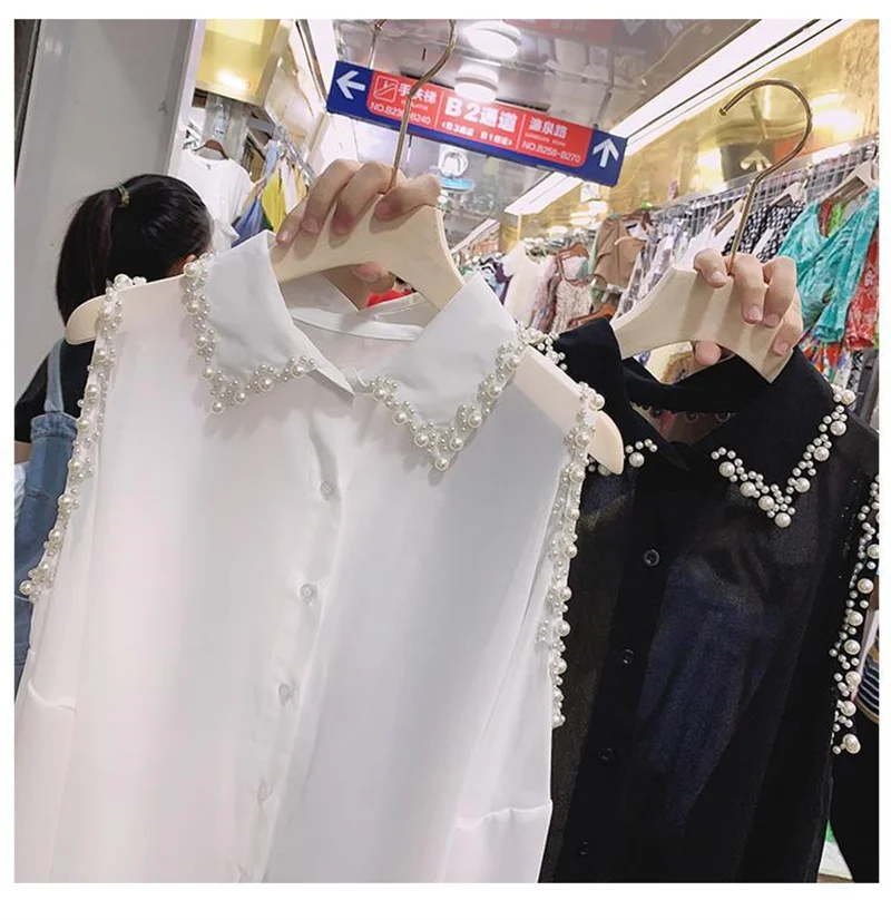 Fashion Women Clothing Thin Pearl Tops Chiffon Loose Off Shoulder Blouse 2025 Spring Summer Lapel Hollow Out Solid Sexy Shirt Tops