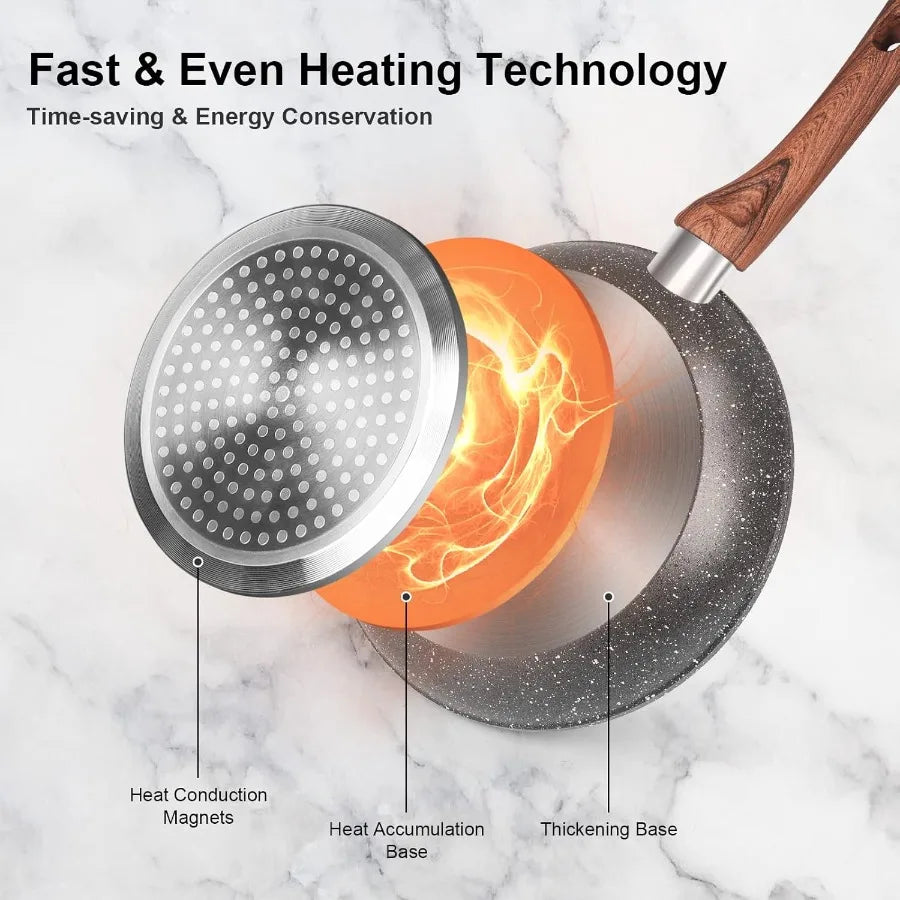 【Versatile Cooking Pan Set】High Magnetic conduction stainless steel base allows our kitchen cookware sets to work on all cooktops, including gas, ceramic, electric, halogen or induction stoves. Time to replace your aging or worn out cookware set with our premium granite cookware set non toxic