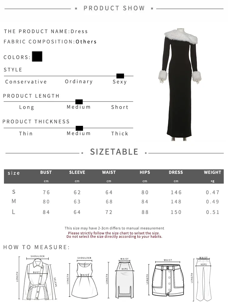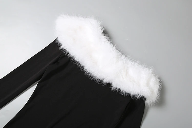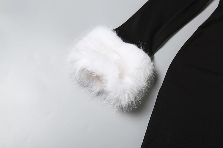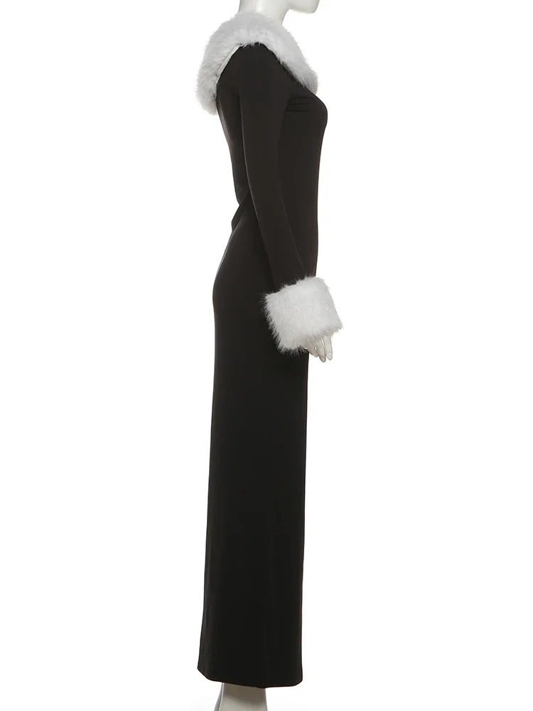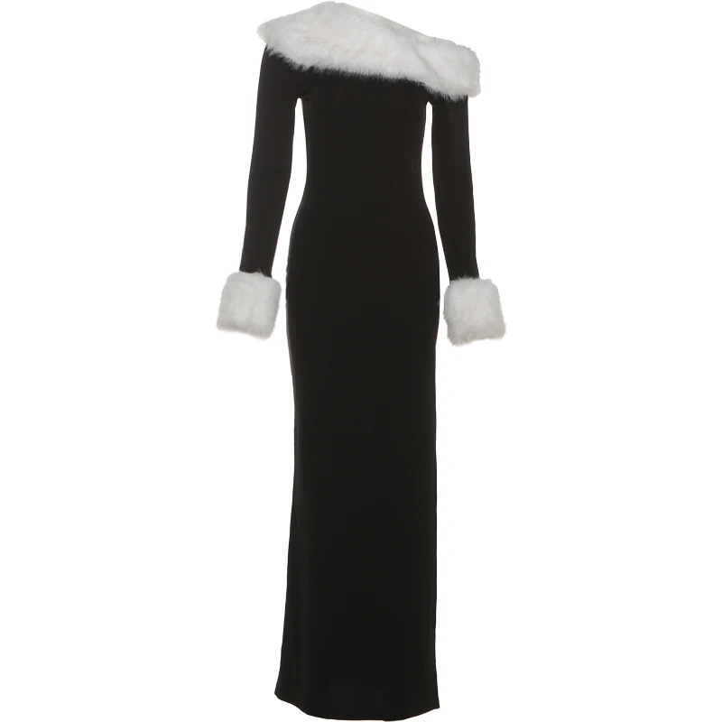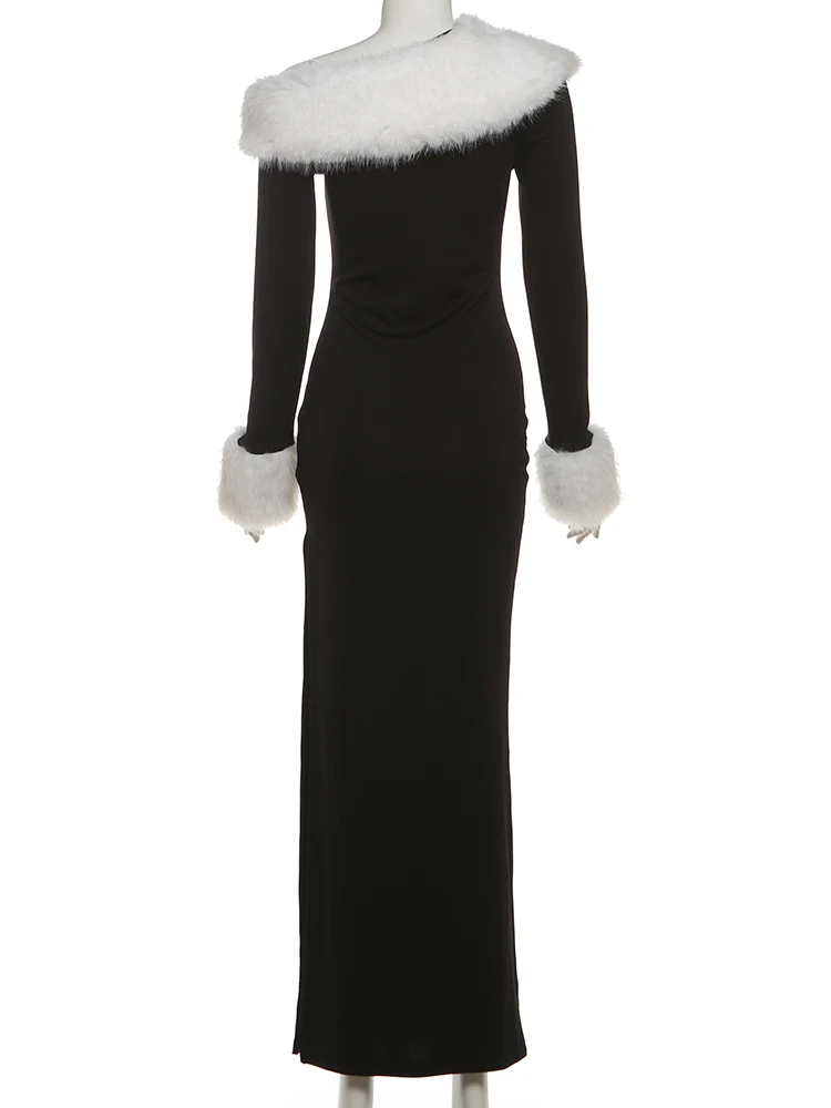 Nibber Elegant Christmas Party Maxi Dress Woman Furry Patchwork Winter Trend Skew Collar Full Sleeve Skinny Robe Style Vestidos