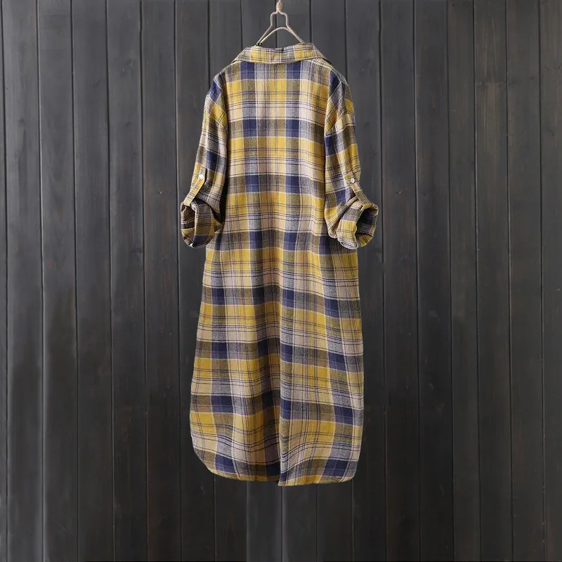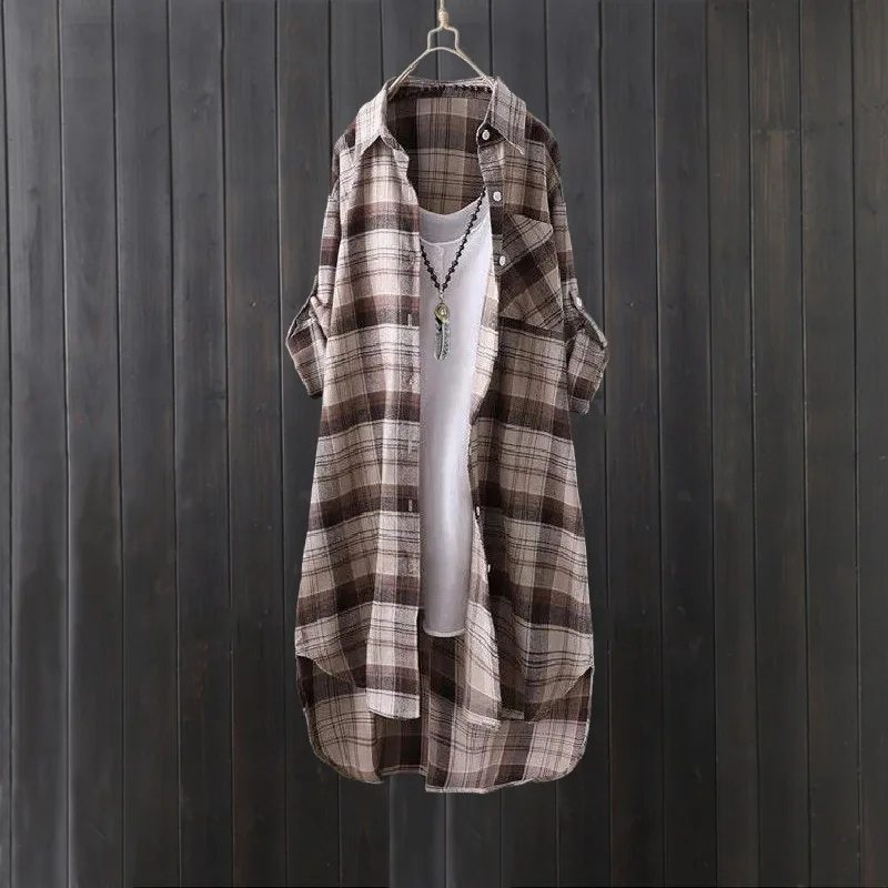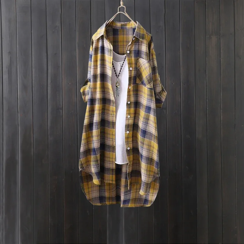 Plaid shirt women's long spring and autumn thin coat Western style long-sleeved shirt loose butt-covering cotton and linen top