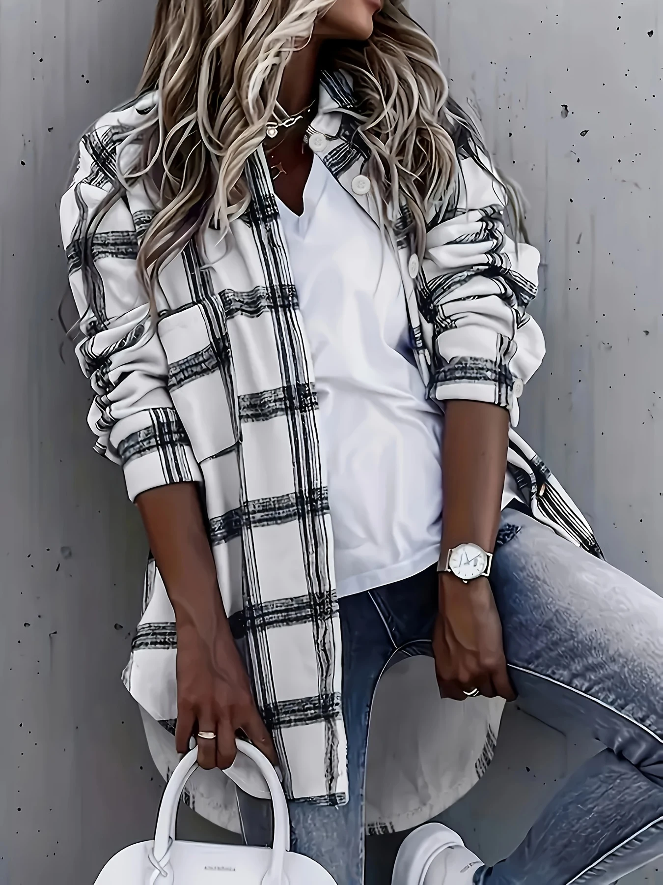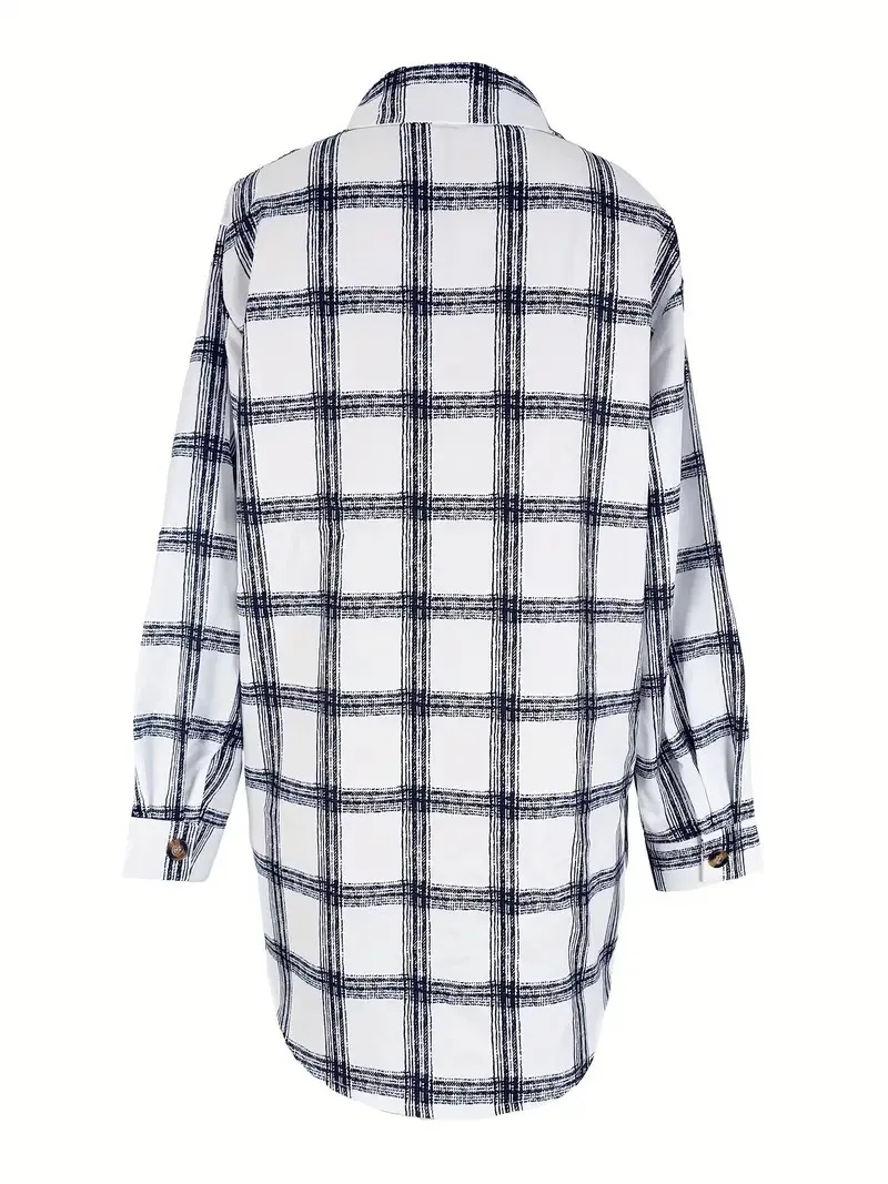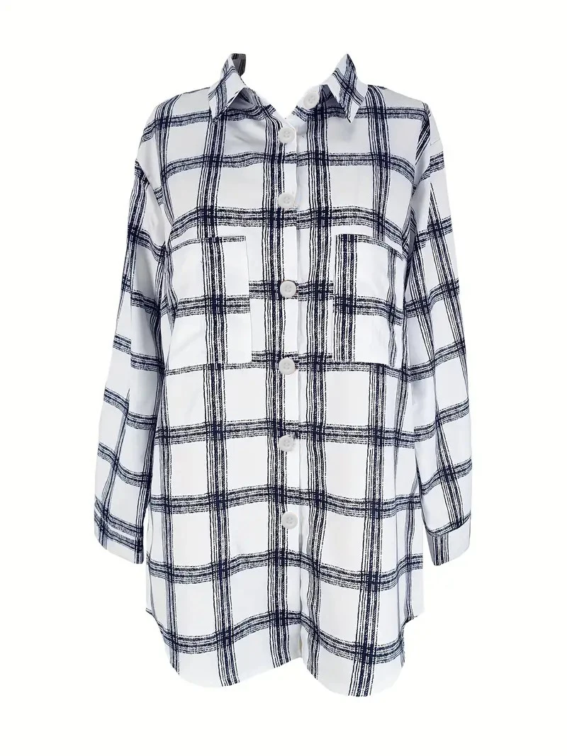 Plus Size Plaid Shirt: Lightweight Artistic Texture Blouse with Notch Collar & Loose Fit Long Sleeves for Office and Casual Wear
