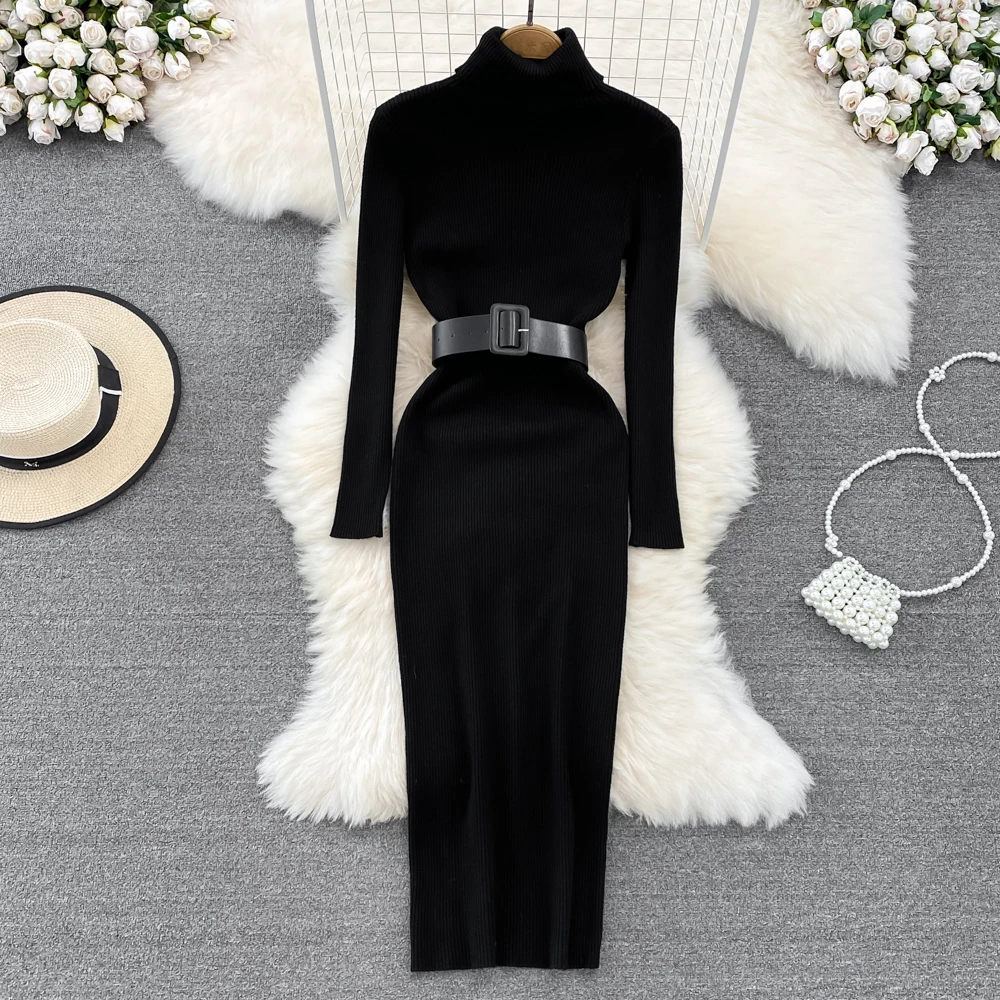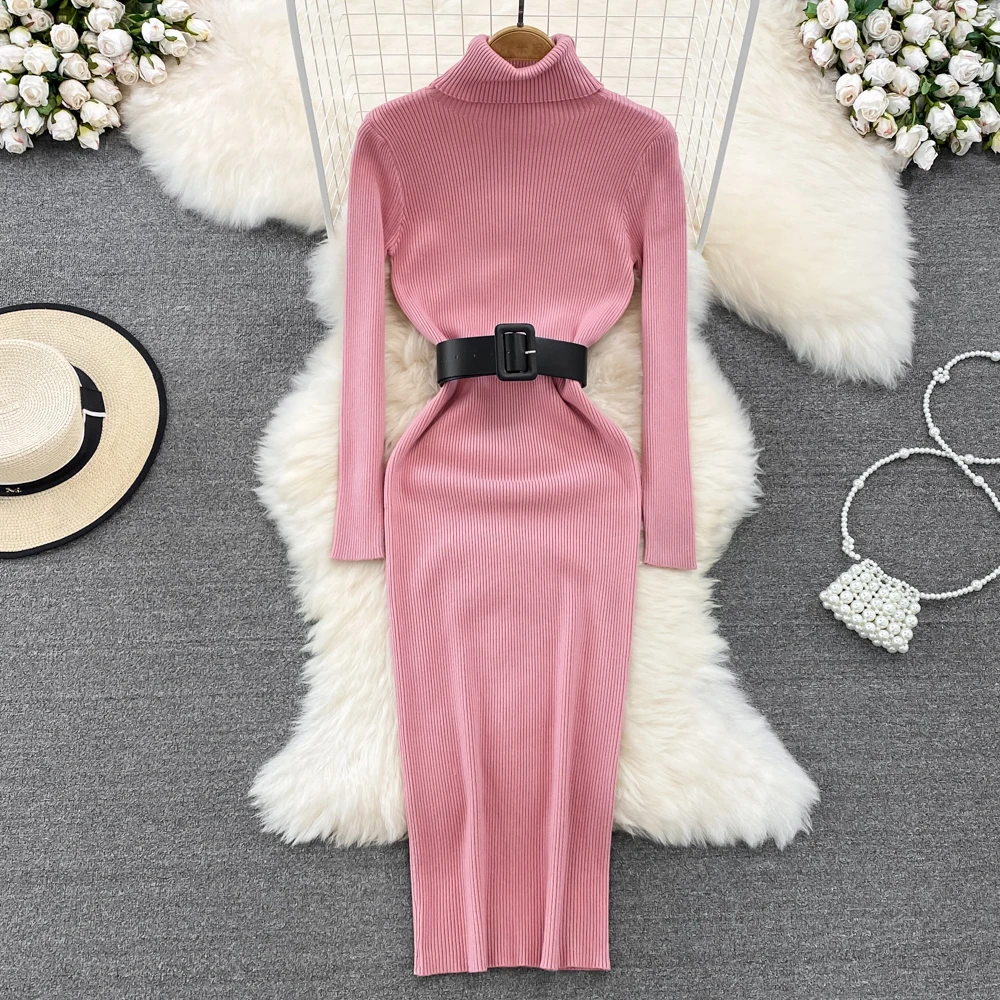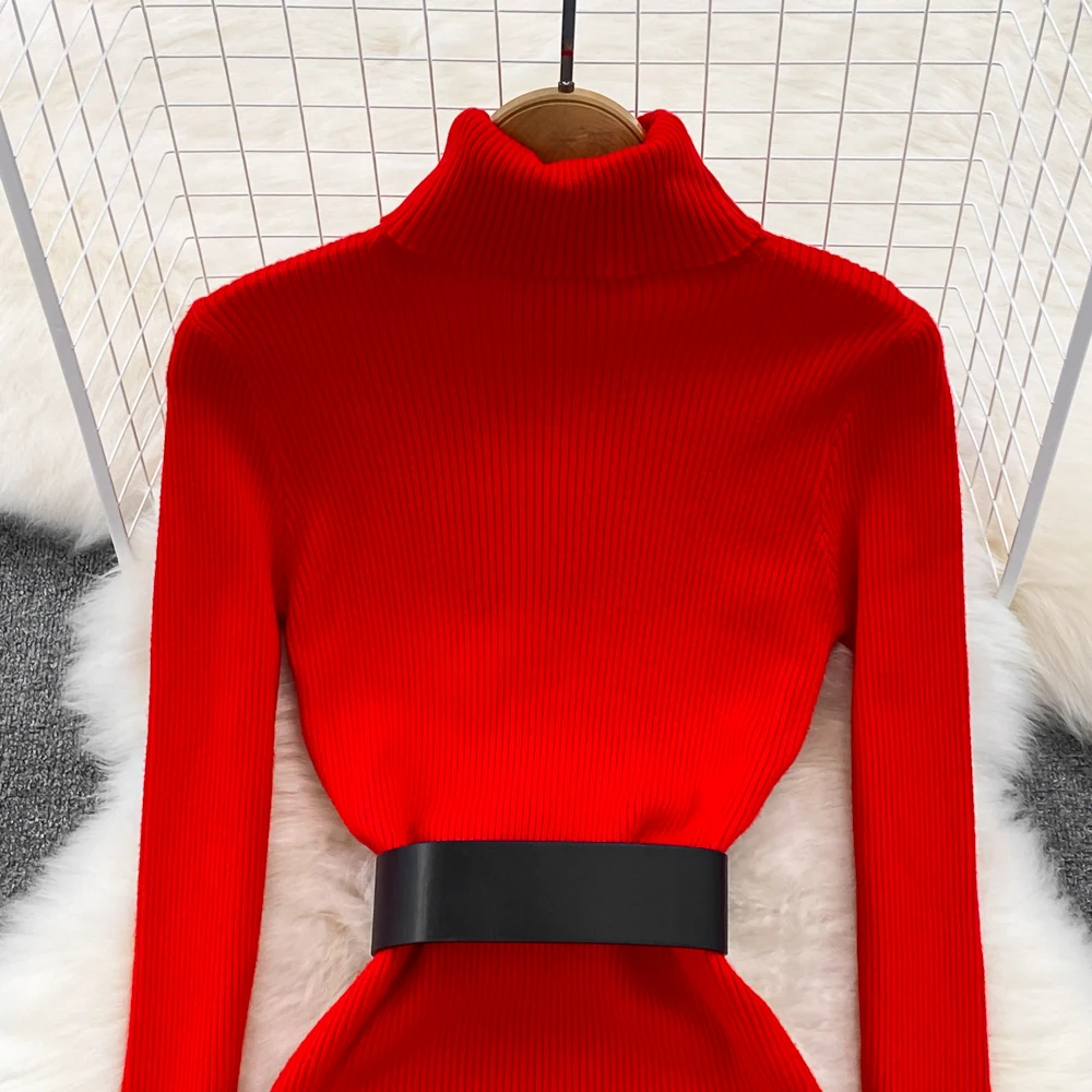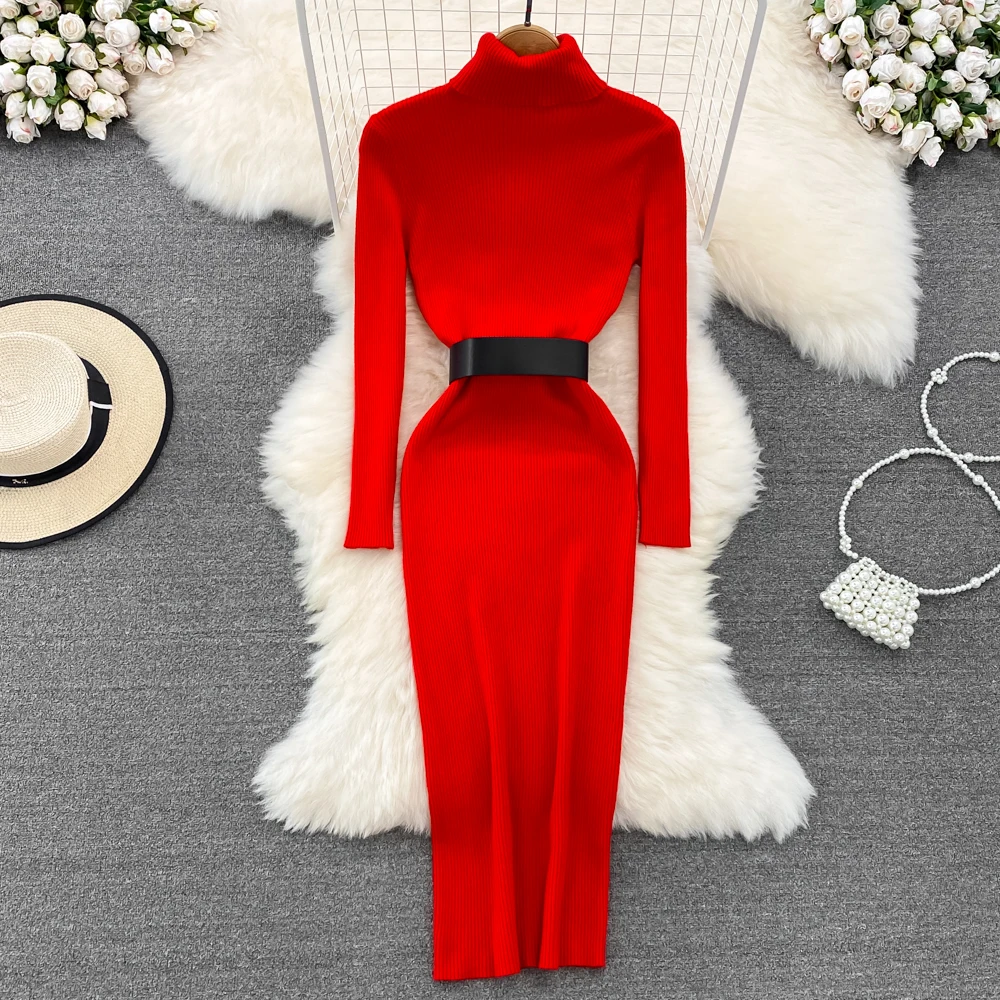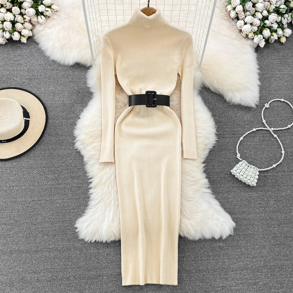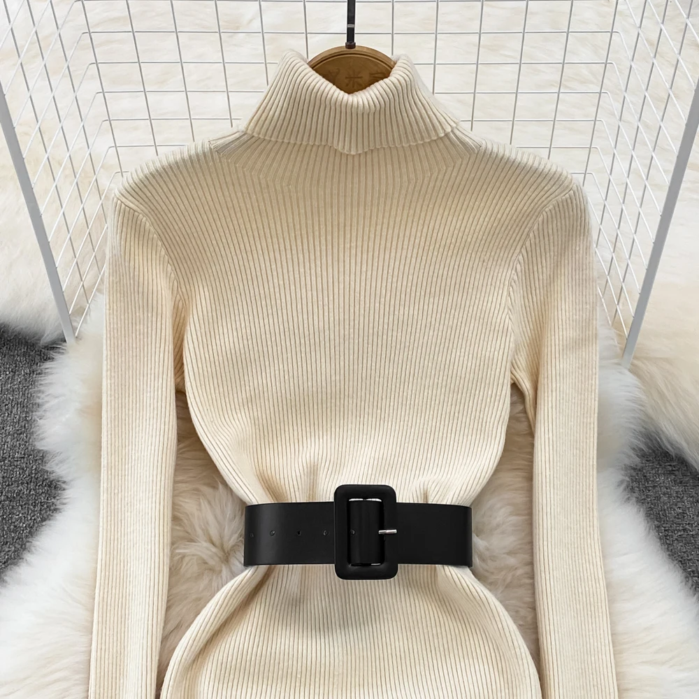 REALEFT Autumn Winter 2025 New Turtleneck Women's Knitted Dresses with Belted Long Sleeve Elegant Bodycon Wrap Dress Female