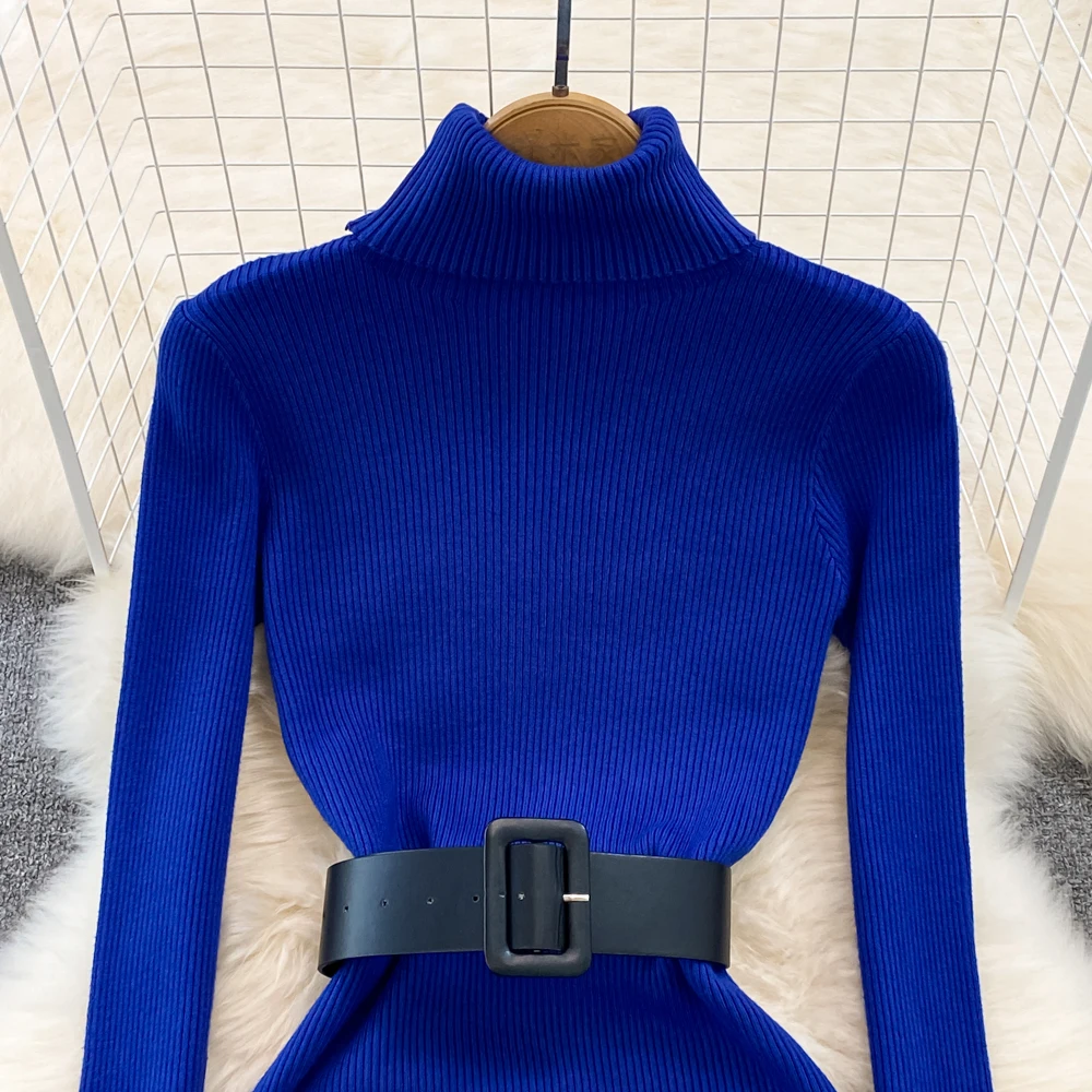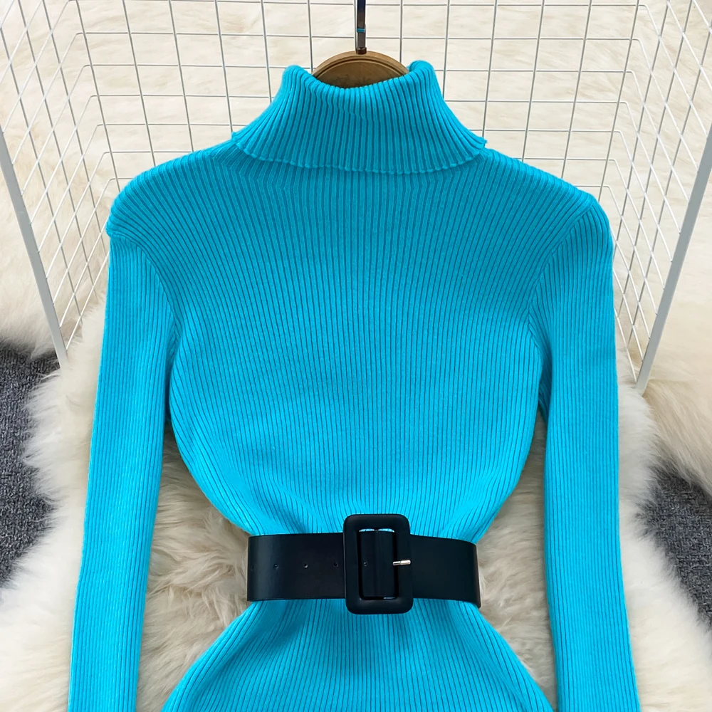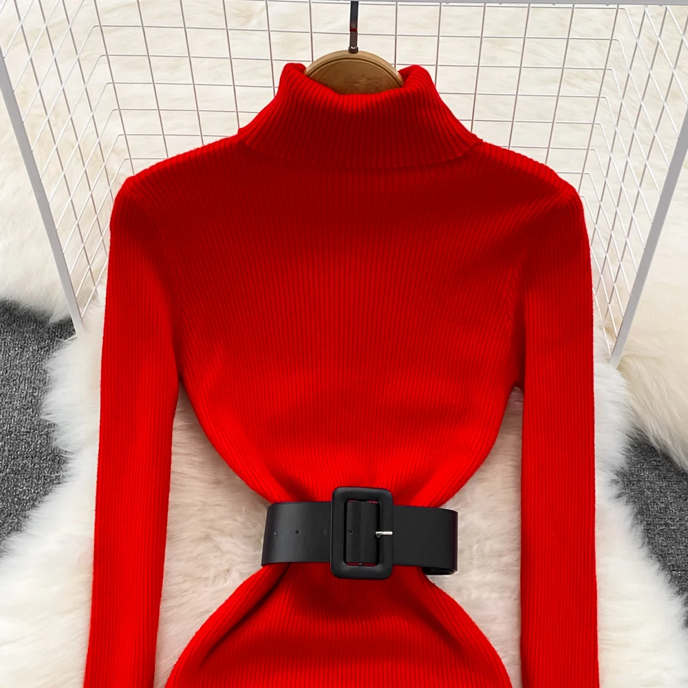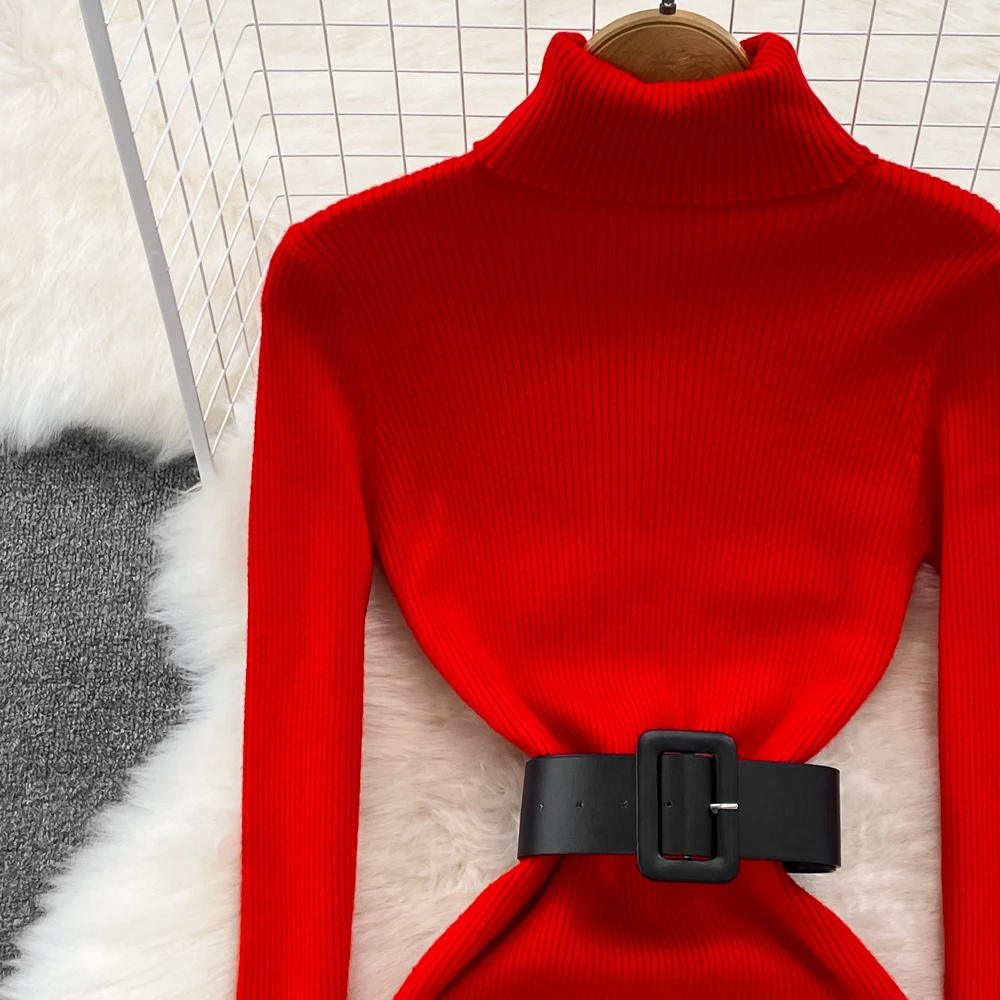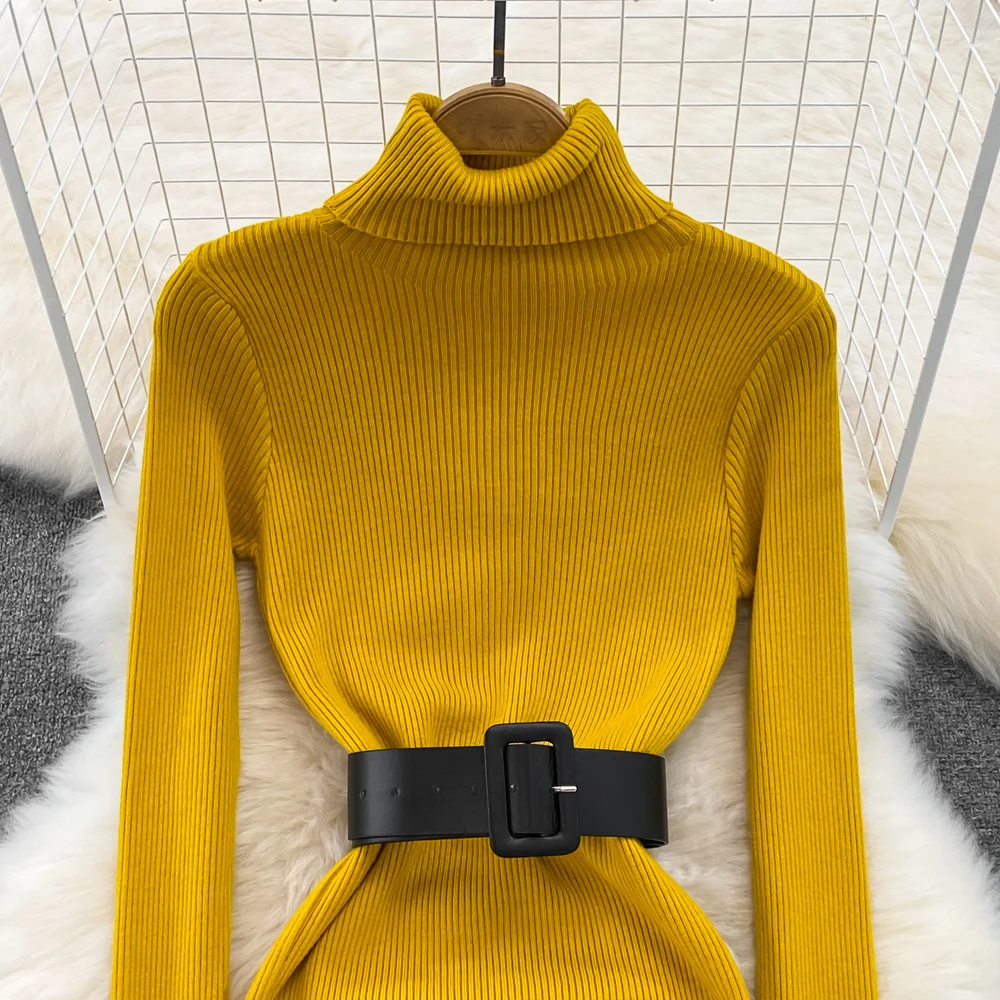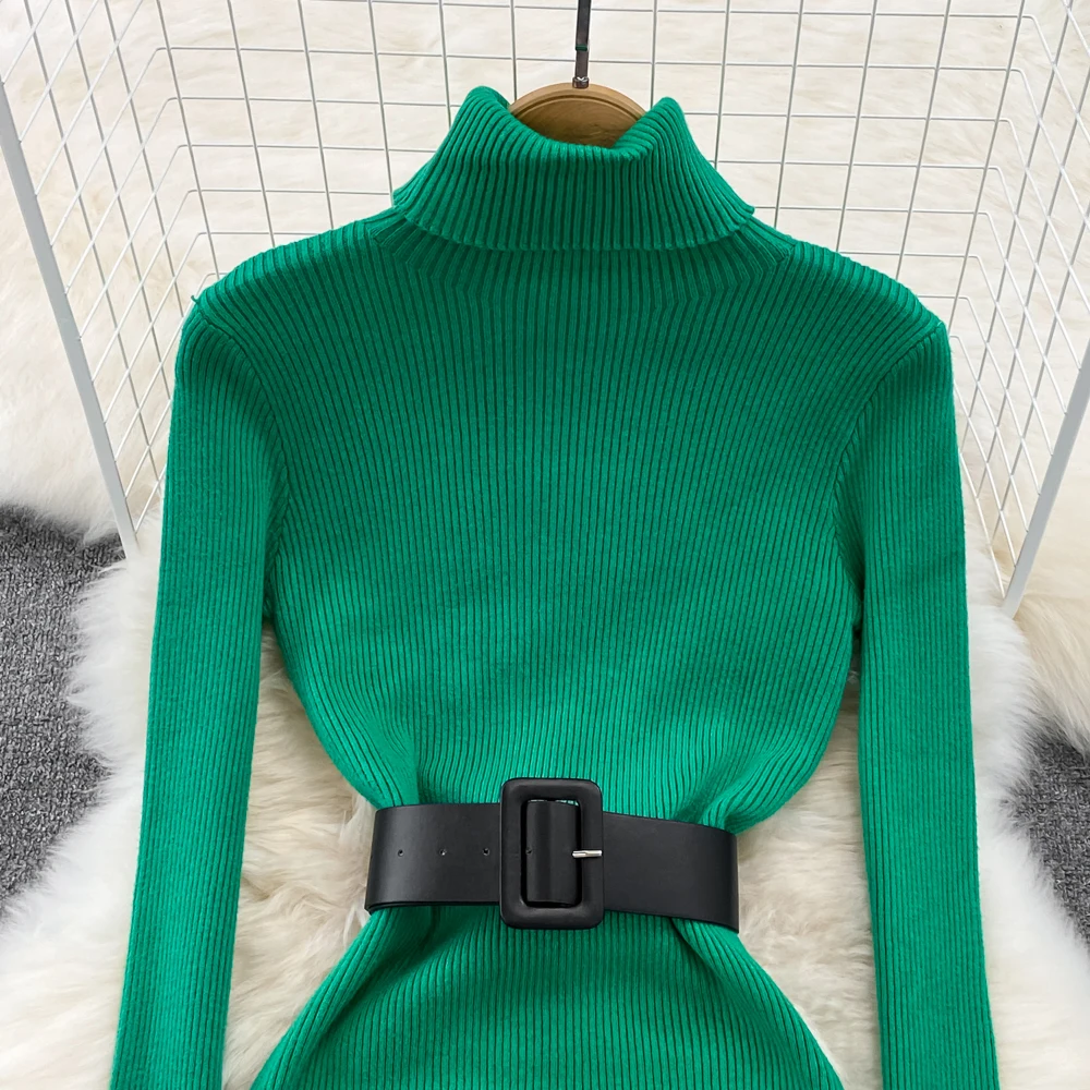 REALEFT Autumn Winter 2025 New Turtleneck Women's Knitted Dresses with Belted Long Sleeve Elegant Bodycon Wrap Dress Female