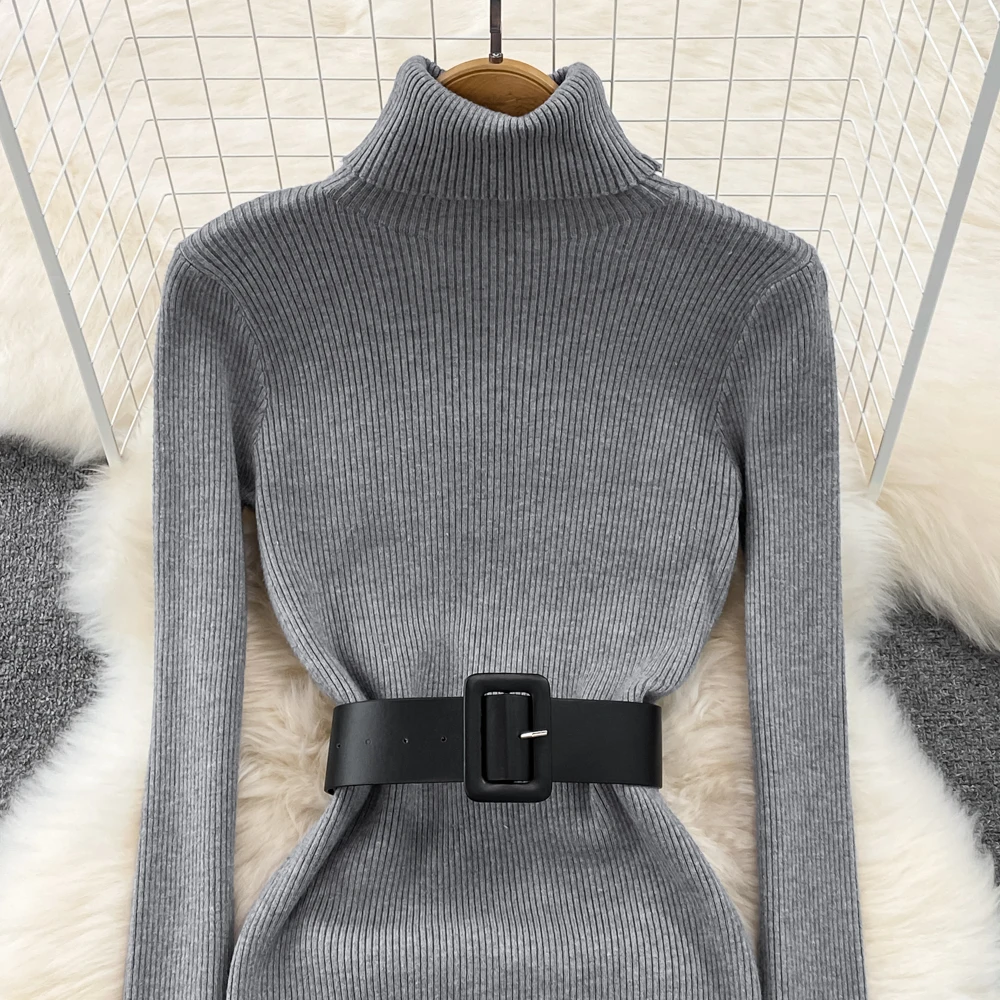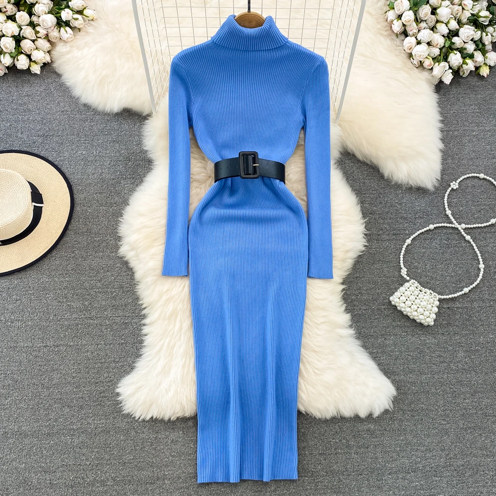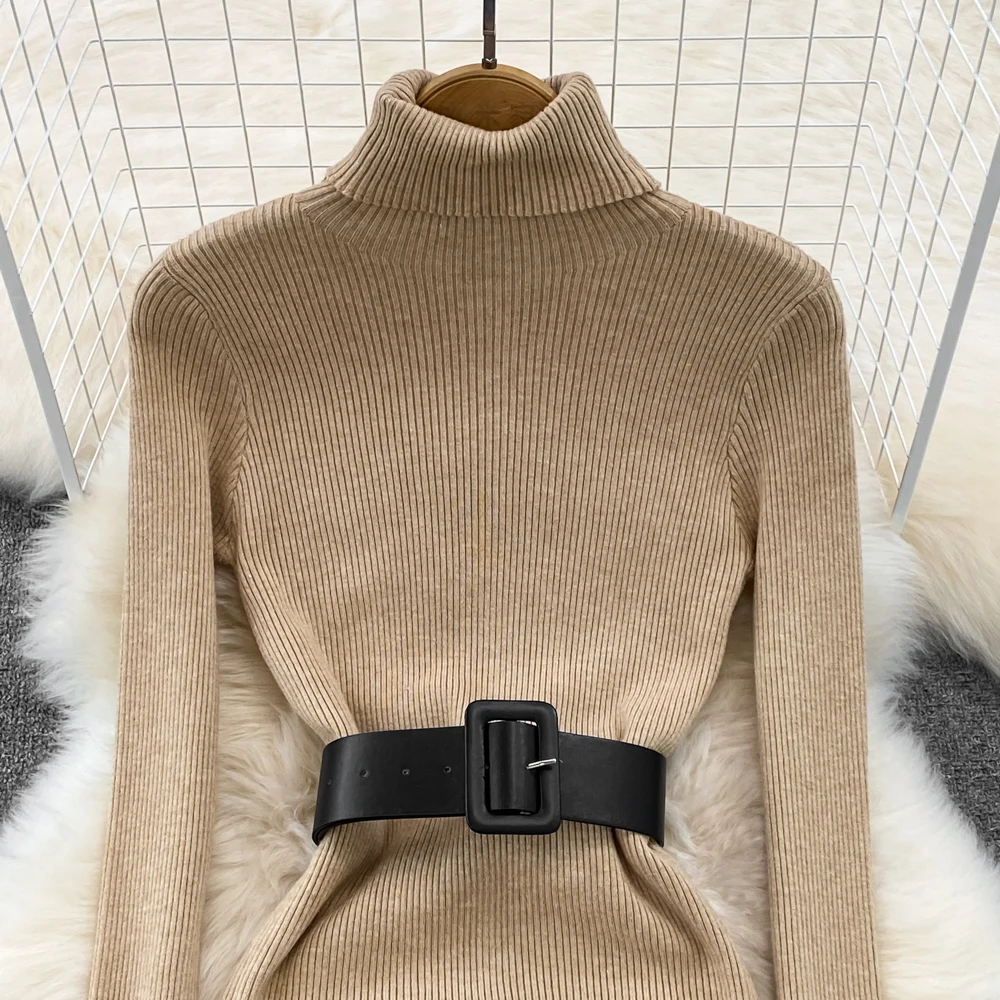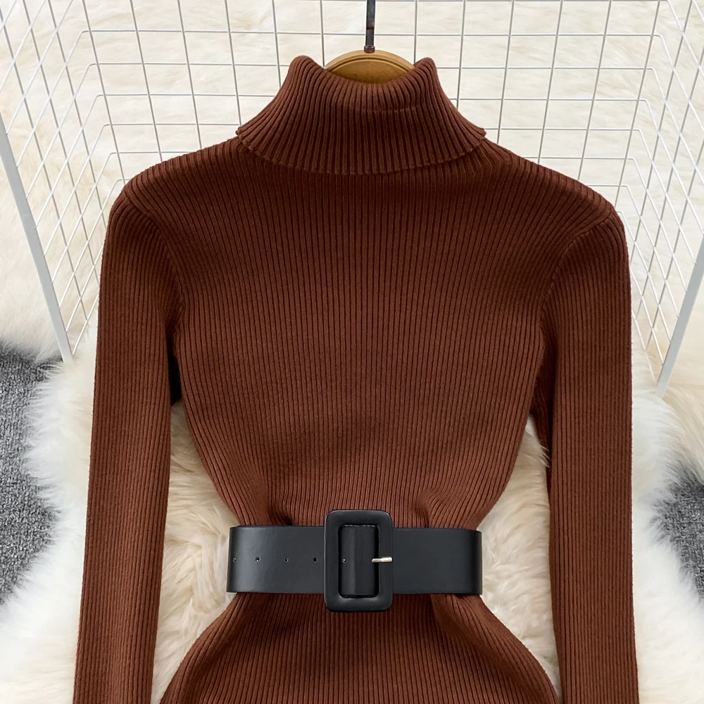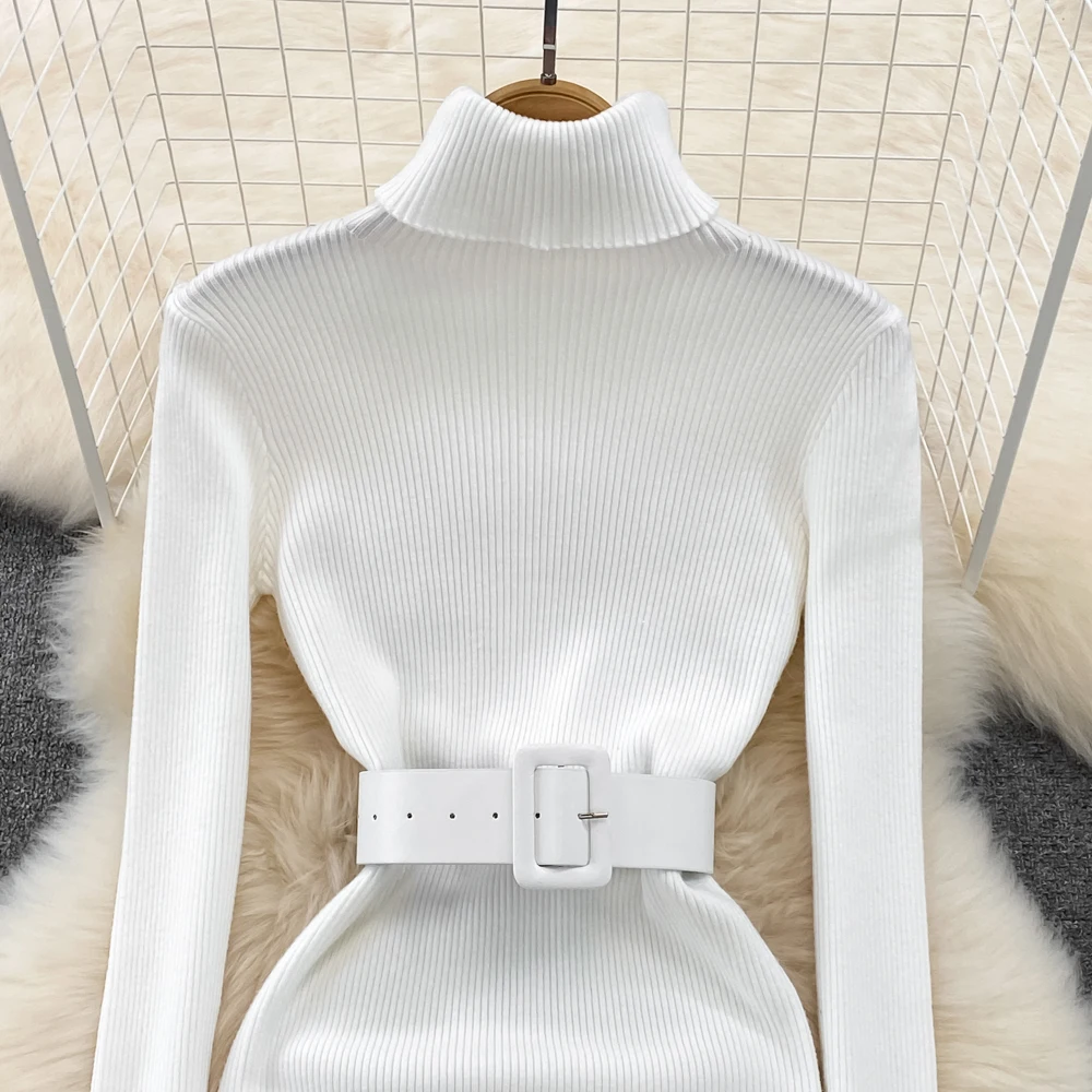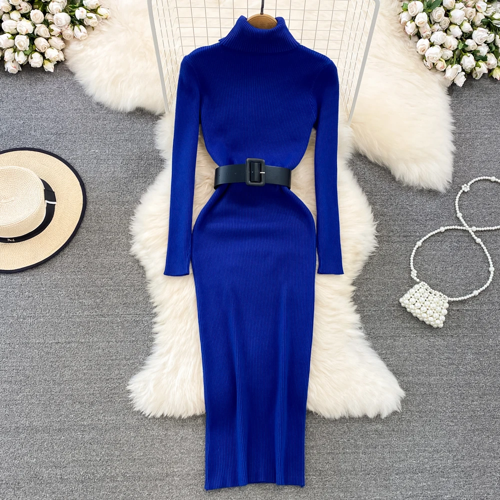 REALEFT Autumn Winter 2025 New Turtleneck Women's Knitted Dresses with Belted Long Sleeve Elegant Bodycon Wrap Dress Female