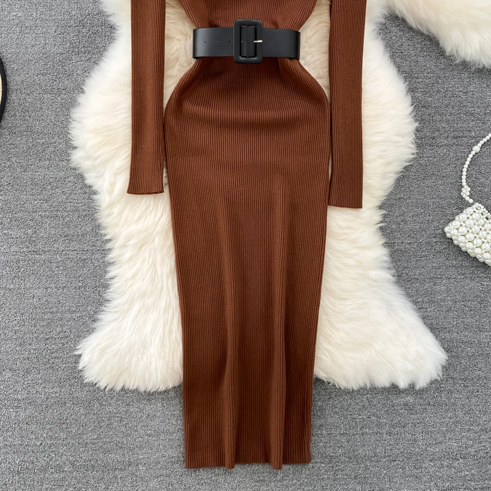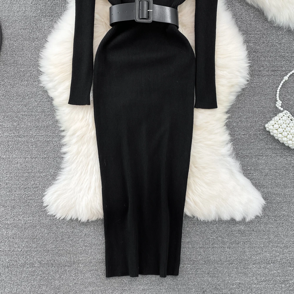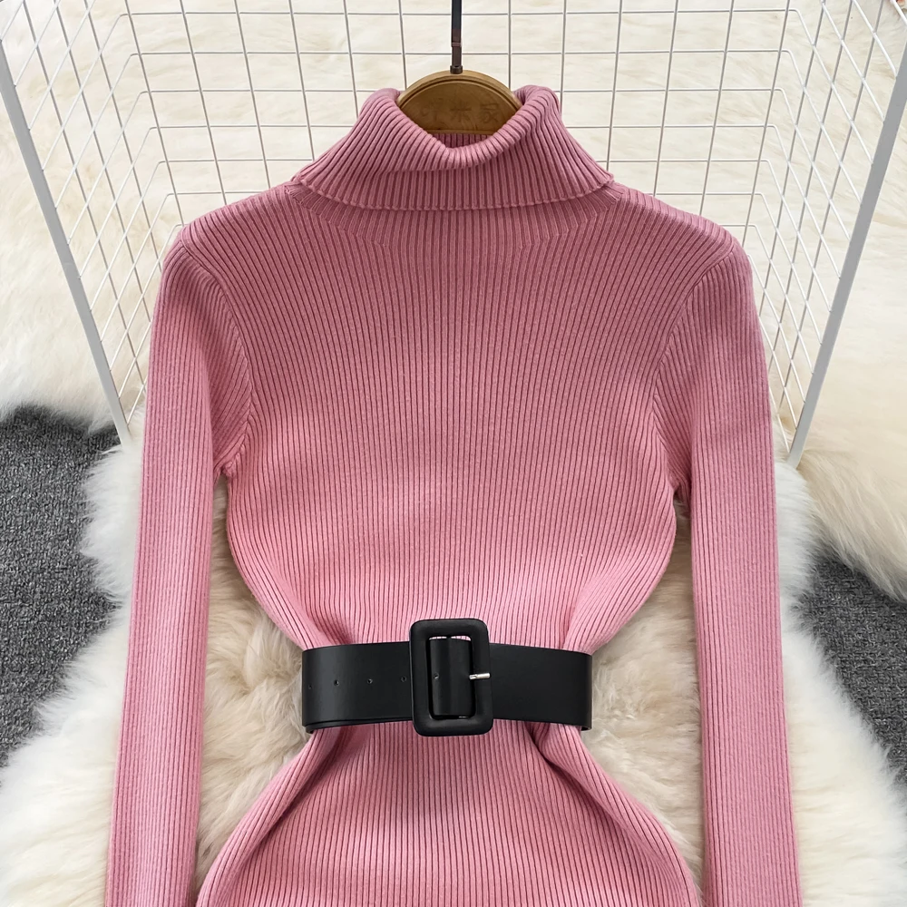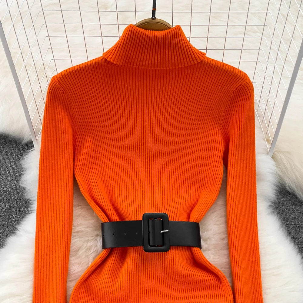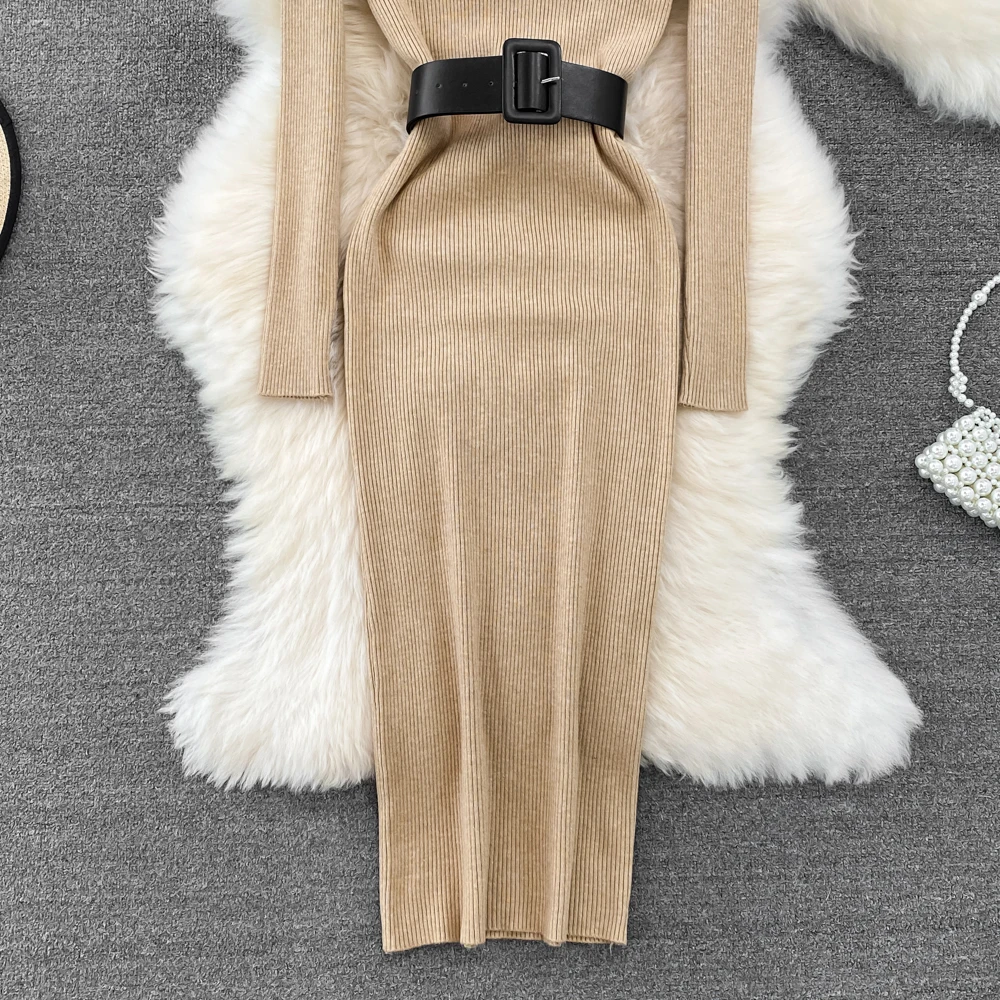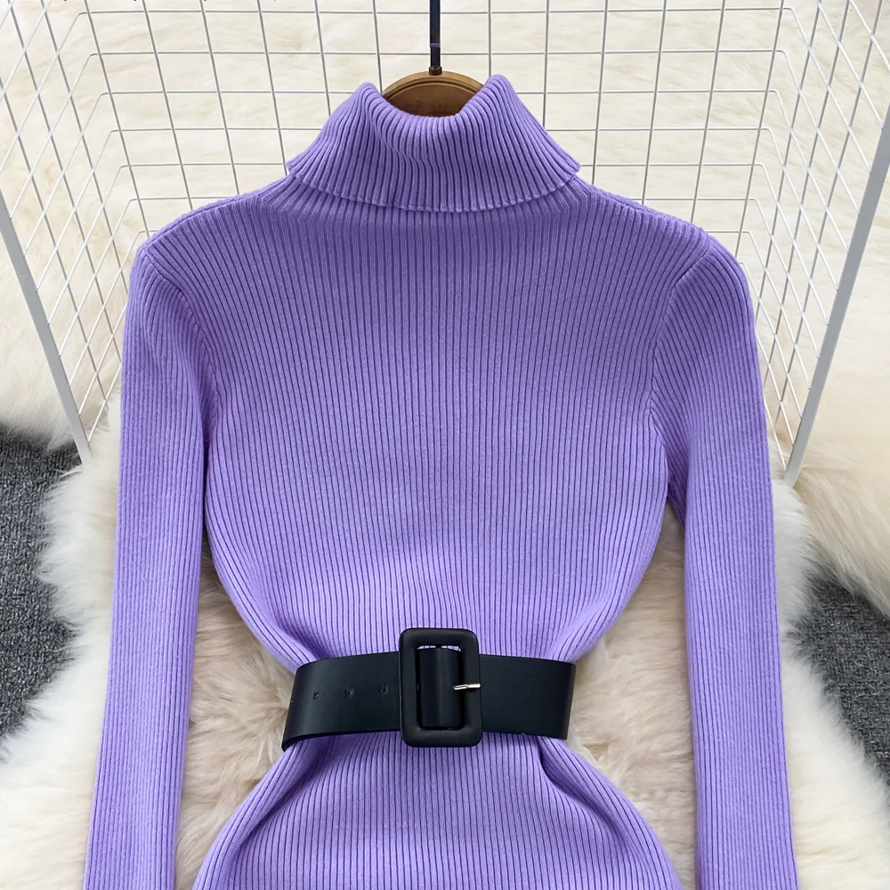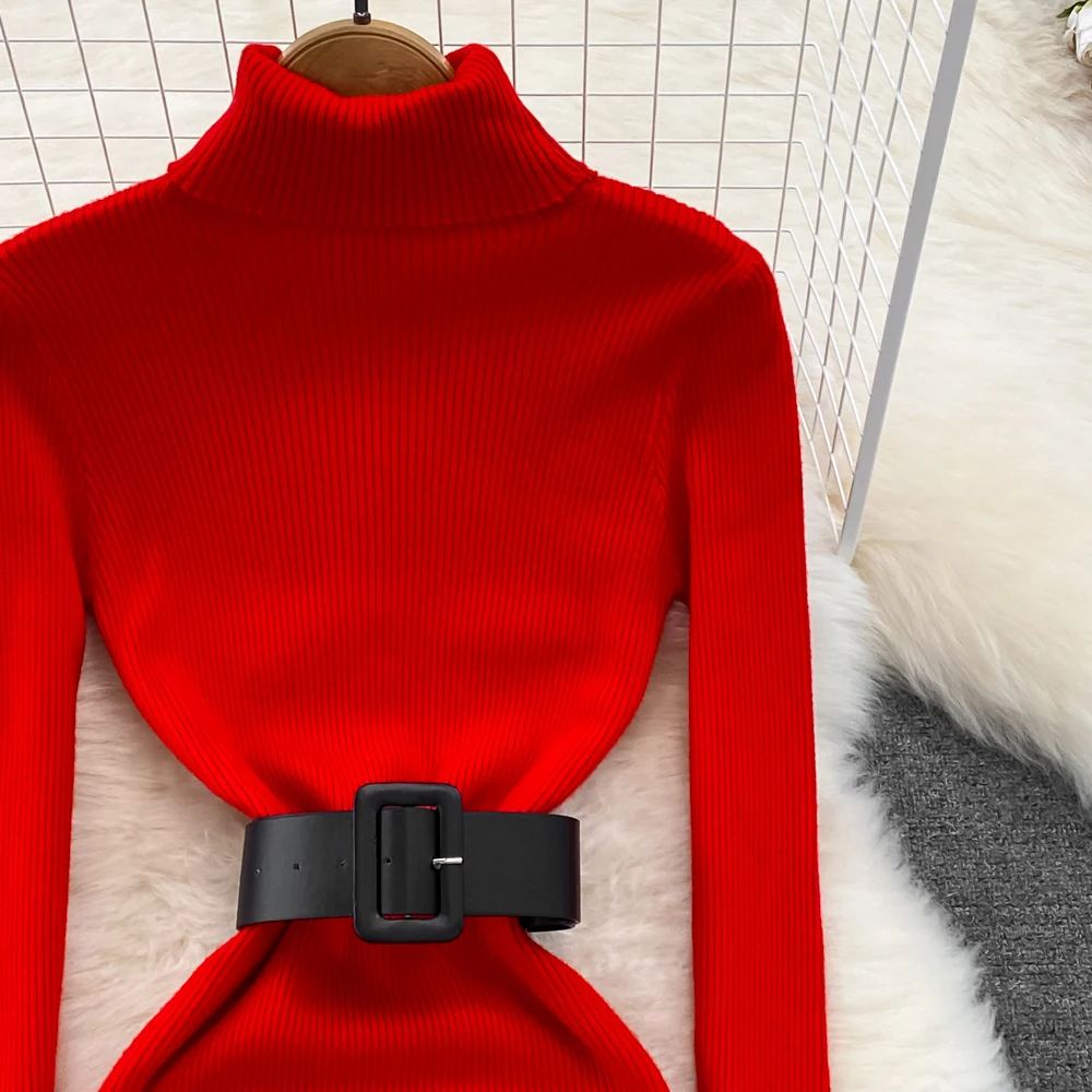 REALEFT Autumn Winter 2025 New Turtleneck Women's Knitted Dresses with Belted Long Sleeve Elegant Bodycon Wrap Dress Female