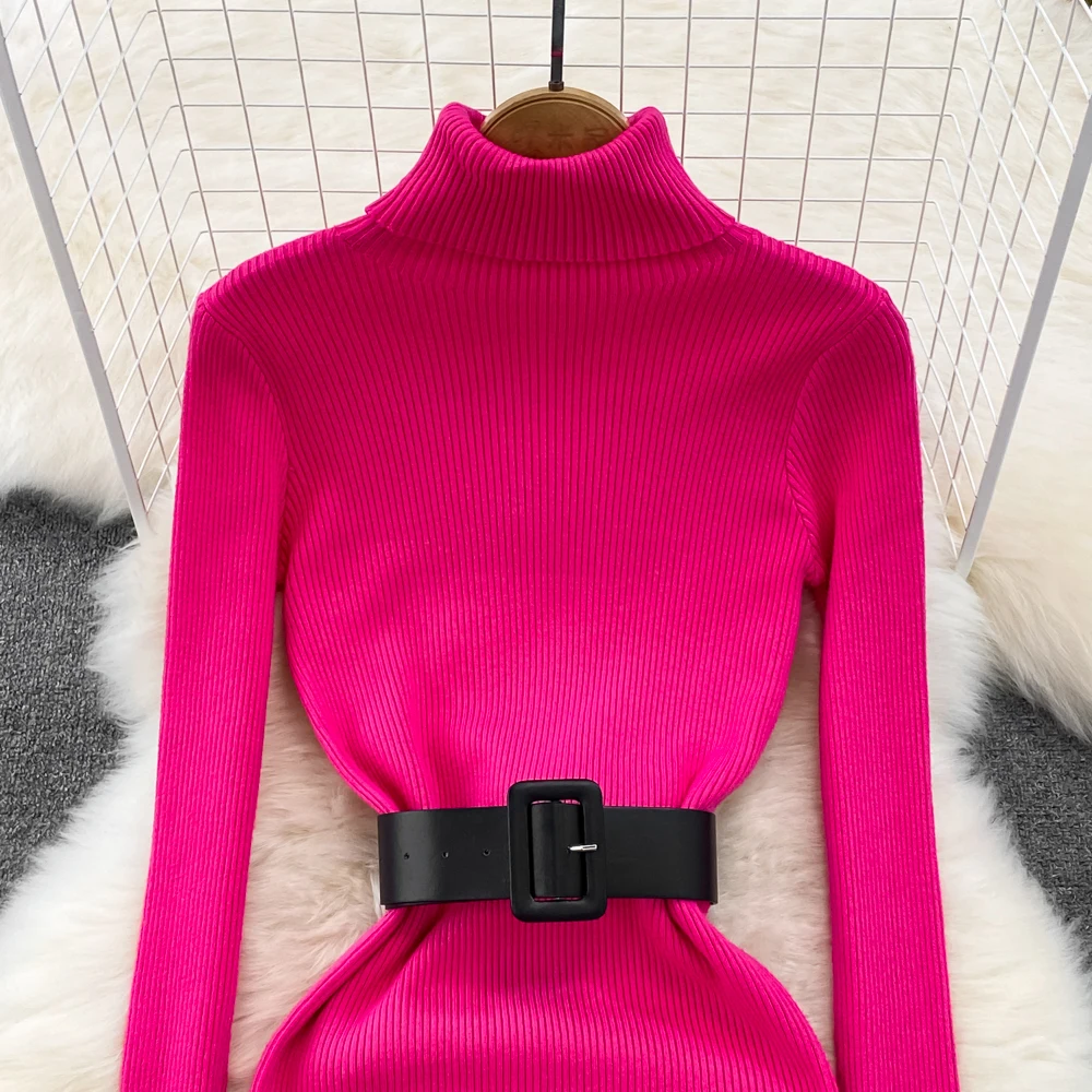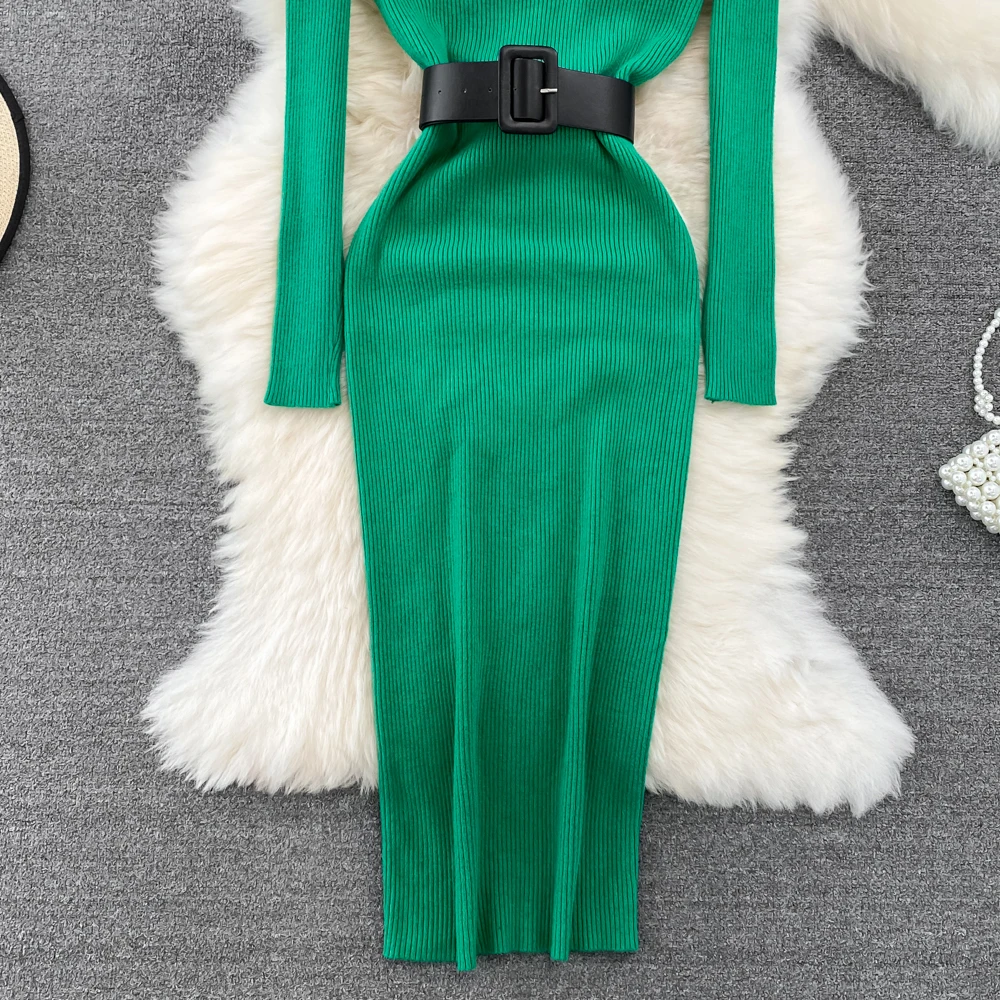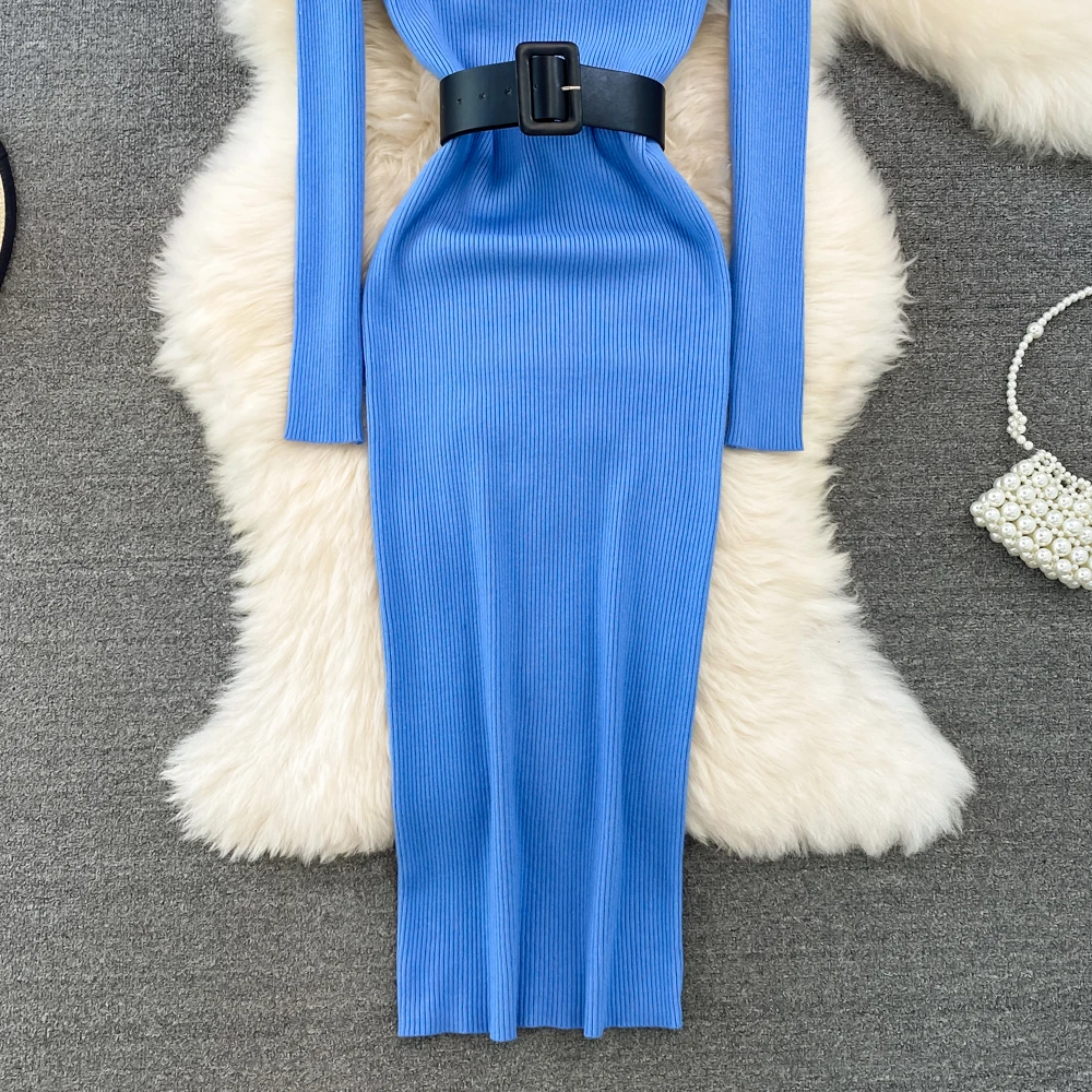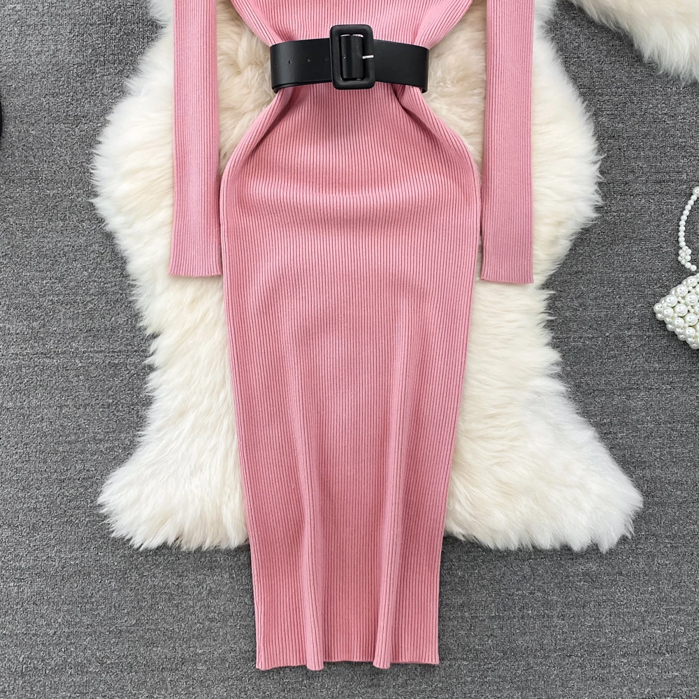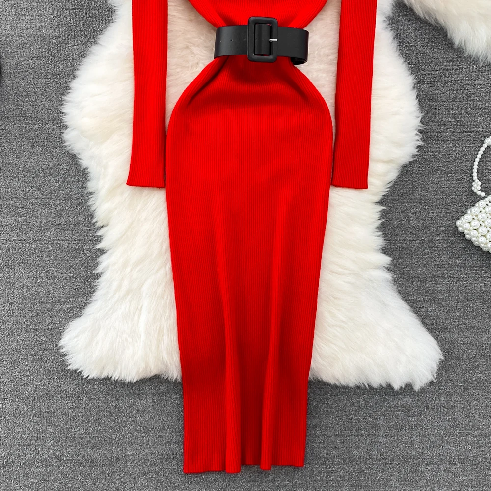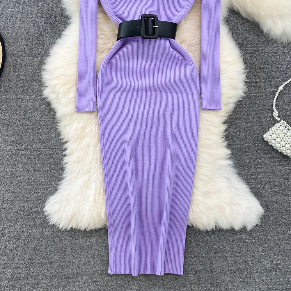 REALEFT Autumn Winter 2025 New Turtleneck Women's Knitted Dresses with Belted Long Sleeve Elegant Bodycon Wrap Dress Female