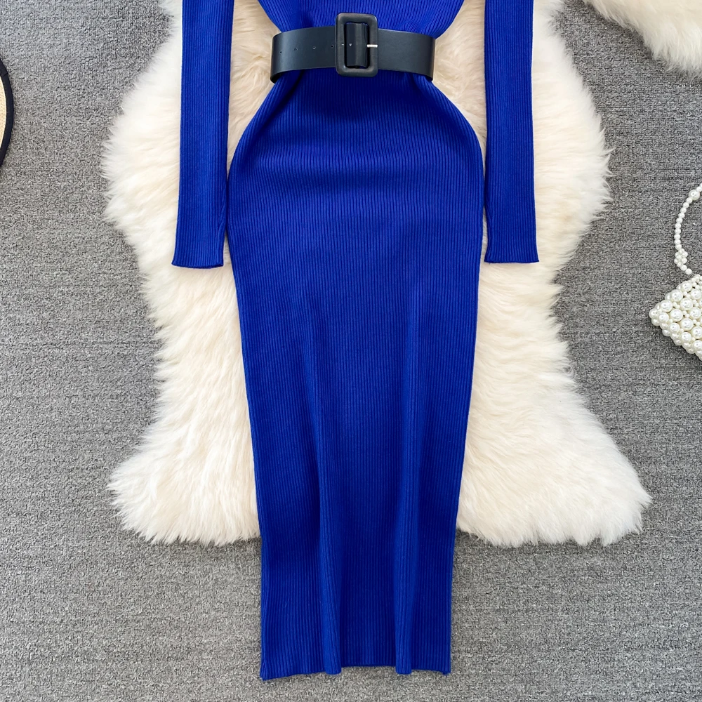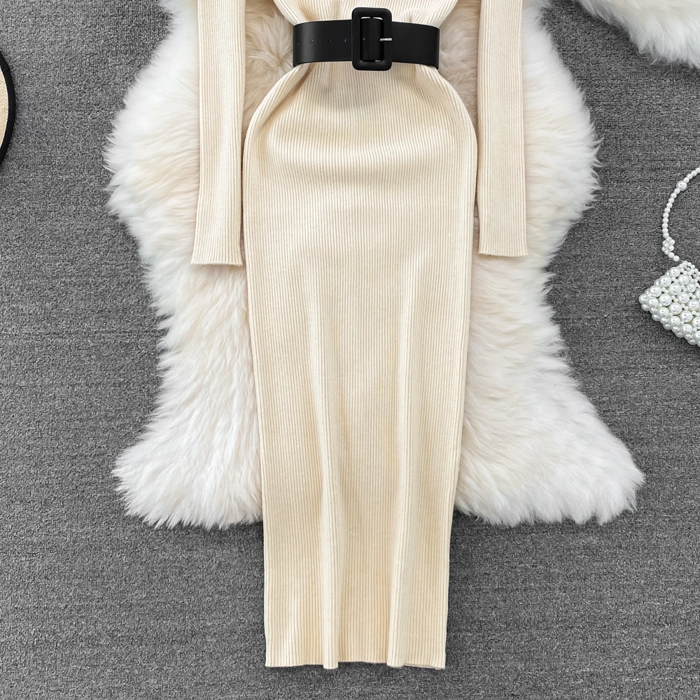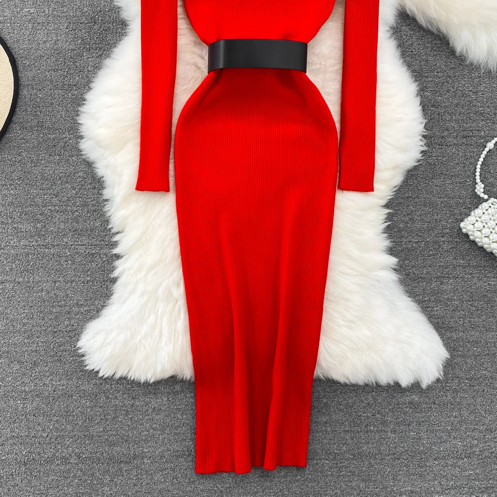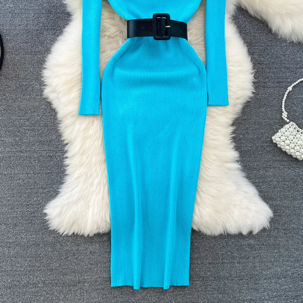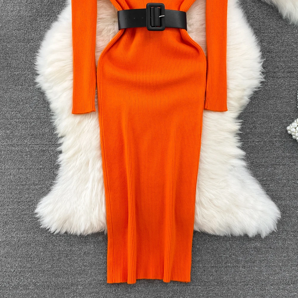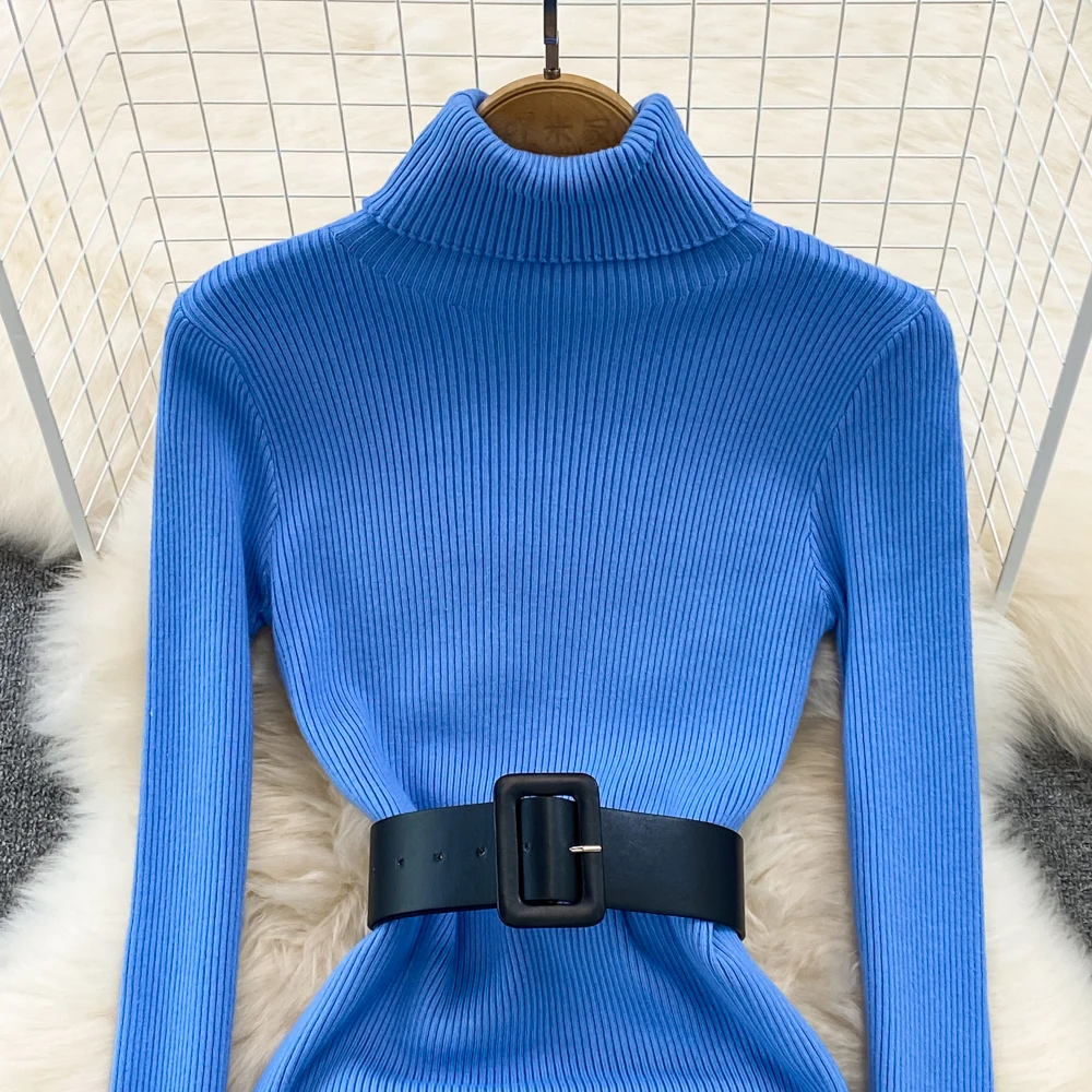 REALEFT Autumn Winter 2025 New Turtleneck Women's Knitted Dresses with Belted Long Sleeve Elegant Bodycon Wrap Dress Female