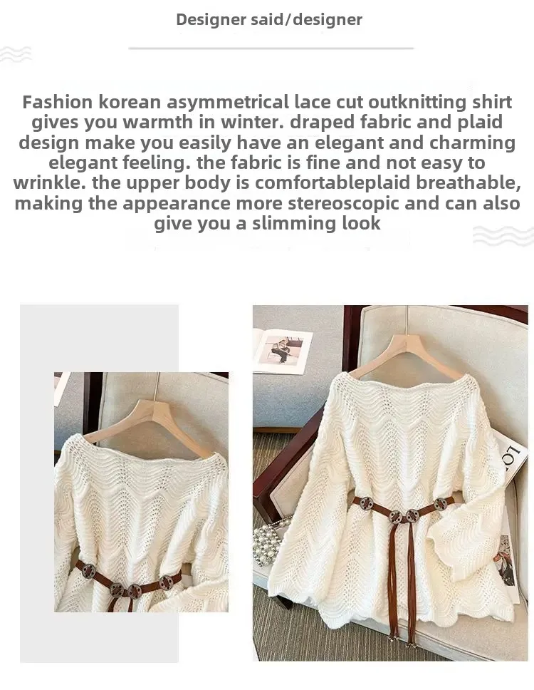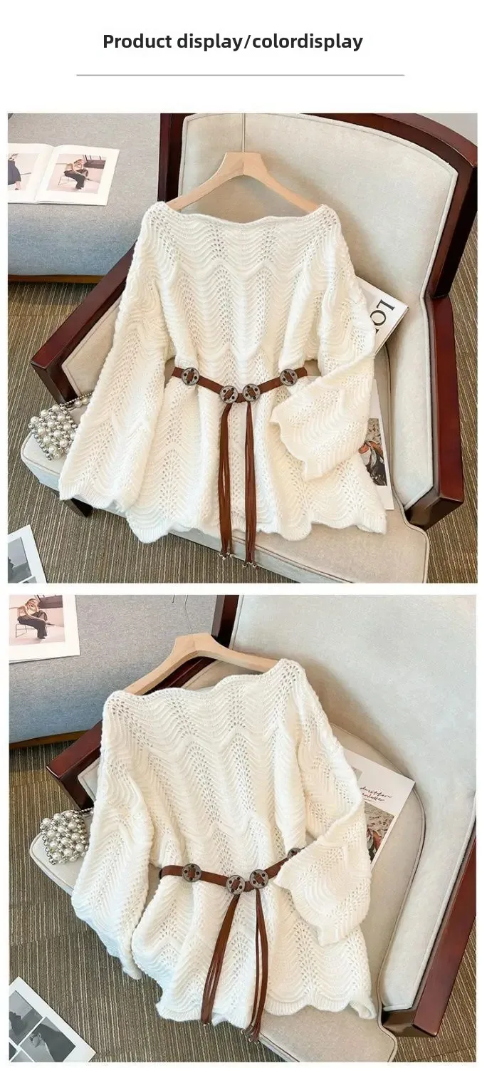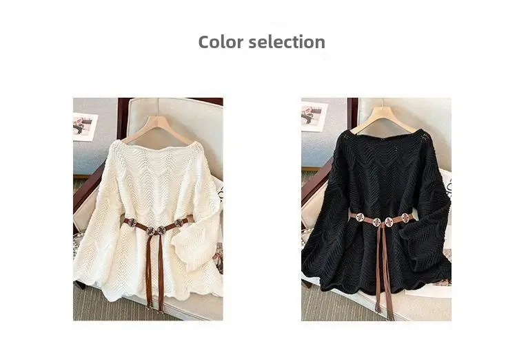 Slimming Knitted Sweater Long Sleeve Pure Color Belted Waist Design Fashionable Anti-Aging Large Size Women's Clothing