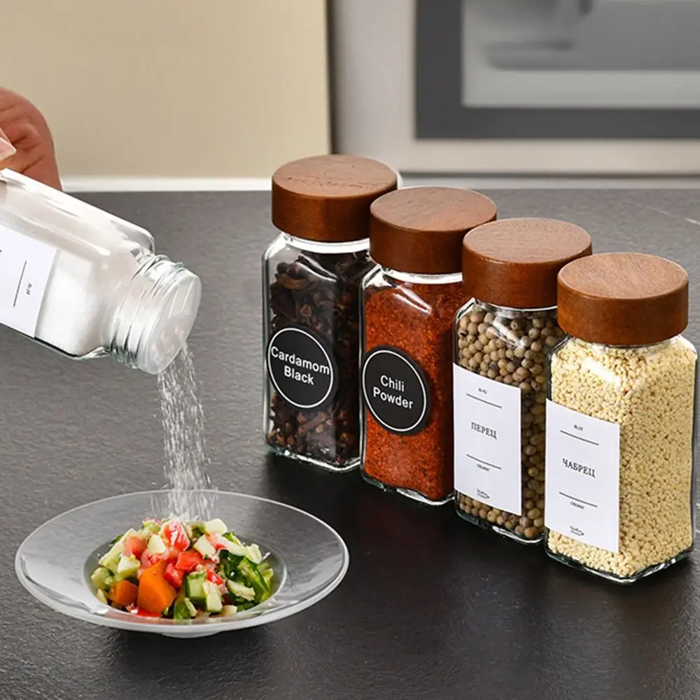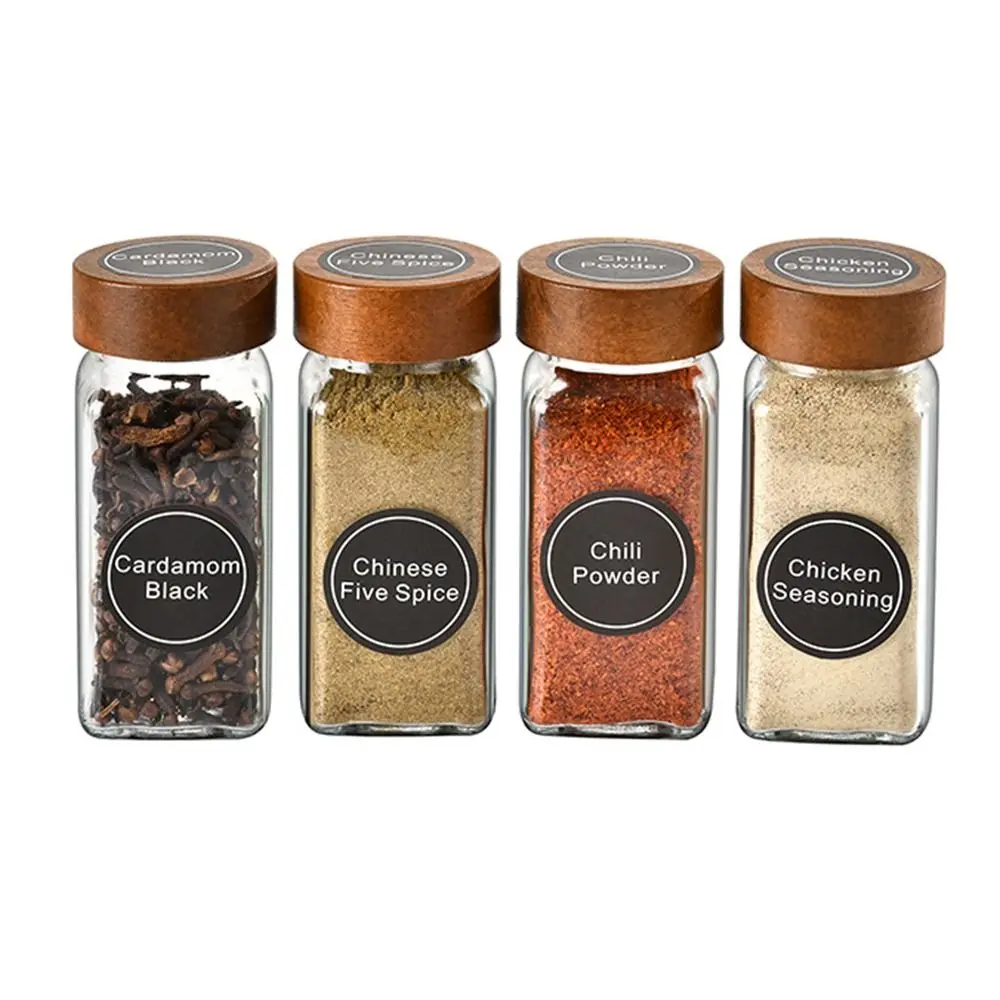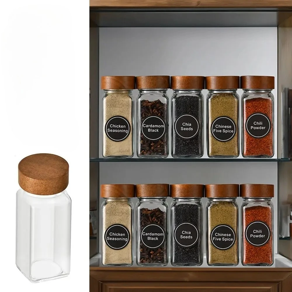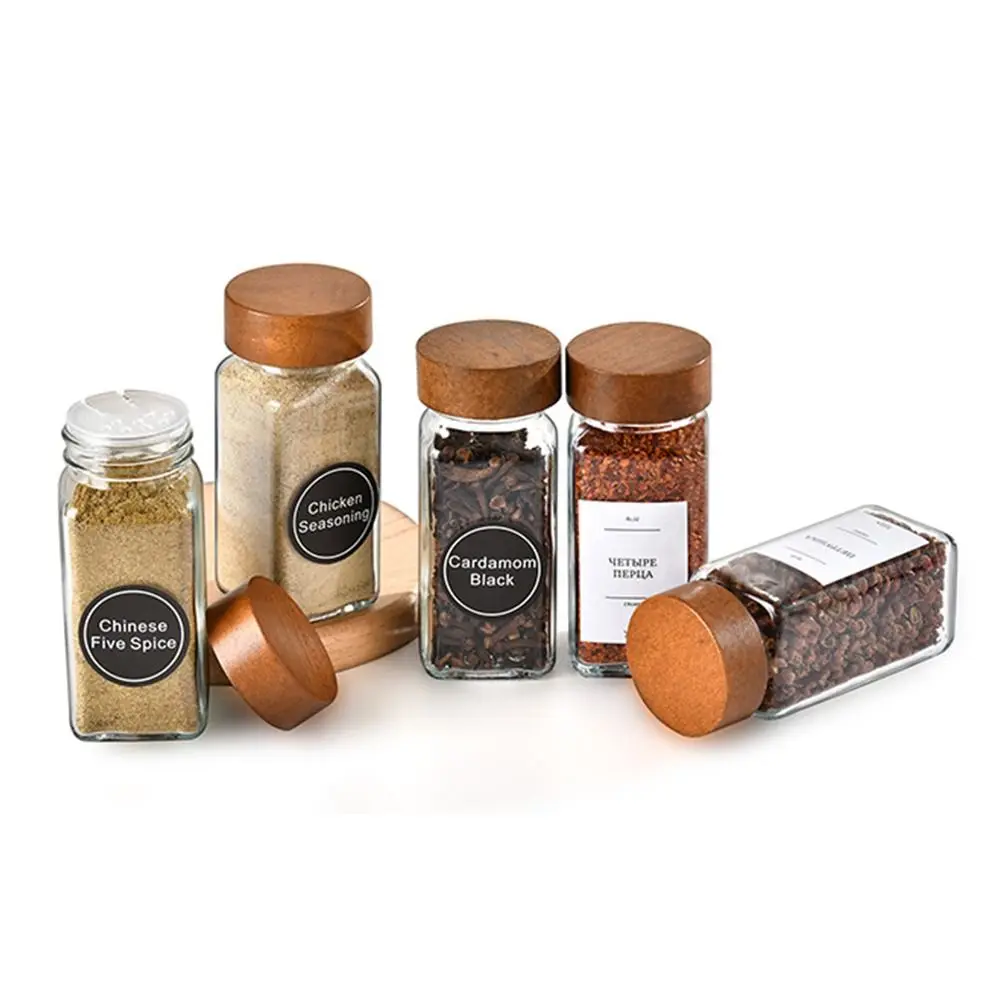 Square Spice Jars with Label with Acacia Wood Lids Dispensing Bottles Glass Sealed Jar Clear Empty Bottles Seasoning Organizer