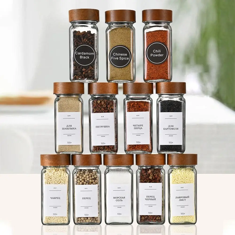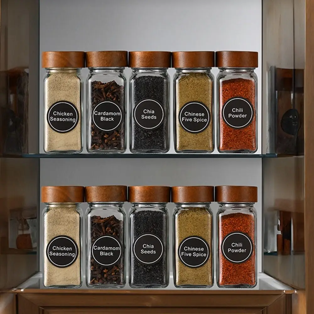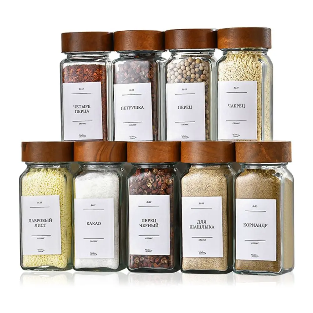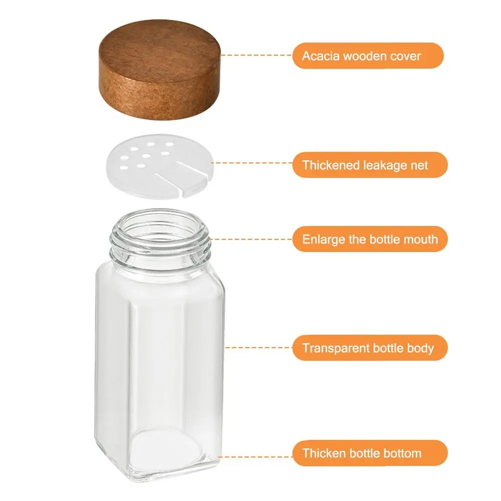 Square Spice Jars with Label with Acacia Wood Lids Dispensing Bottles Glass Sealed Jar Clear Empty Bottles Seasoning Organizer