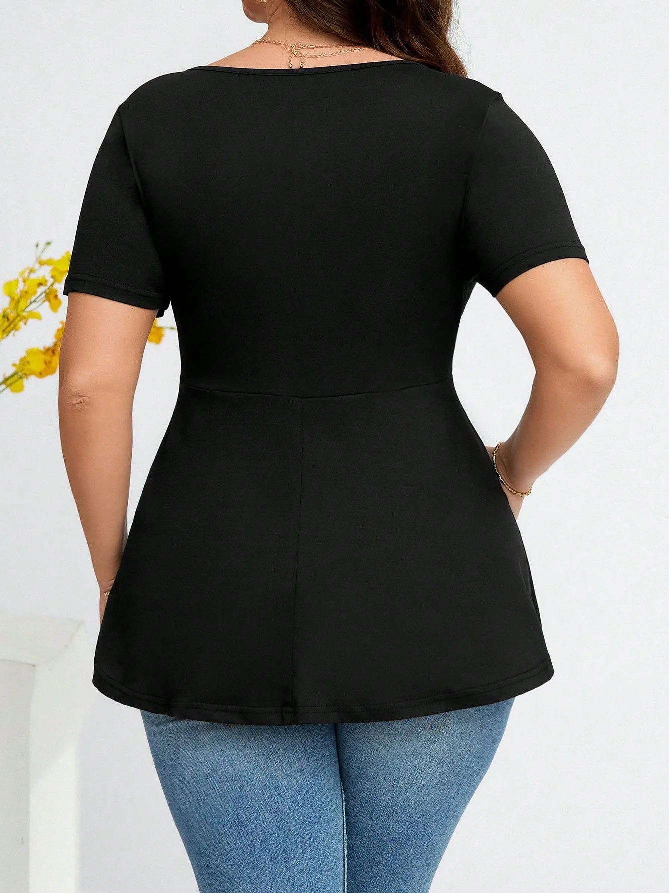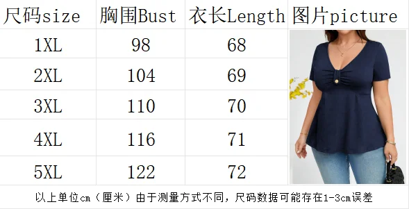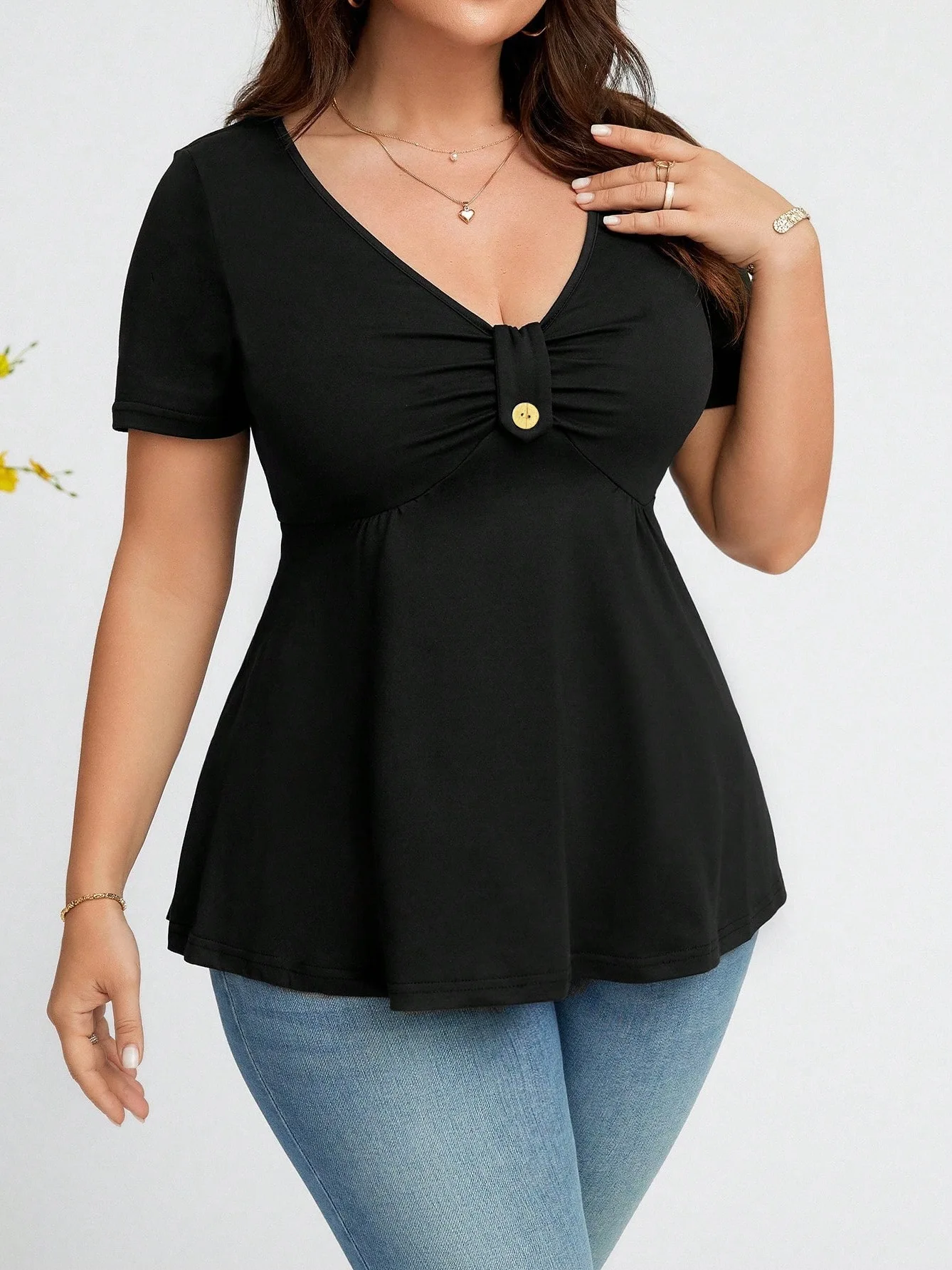 Summer new plus size women's casual solid color chest buckle waist cinched V-neck short sleeved T-shirt
