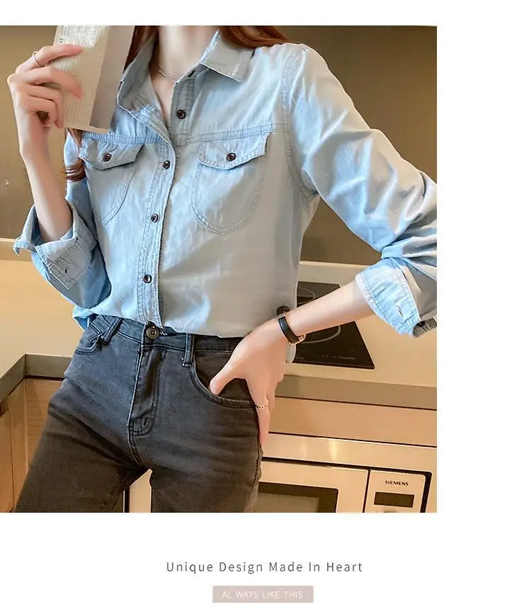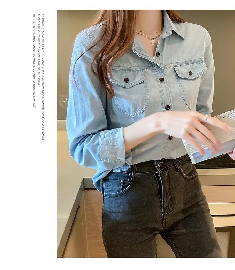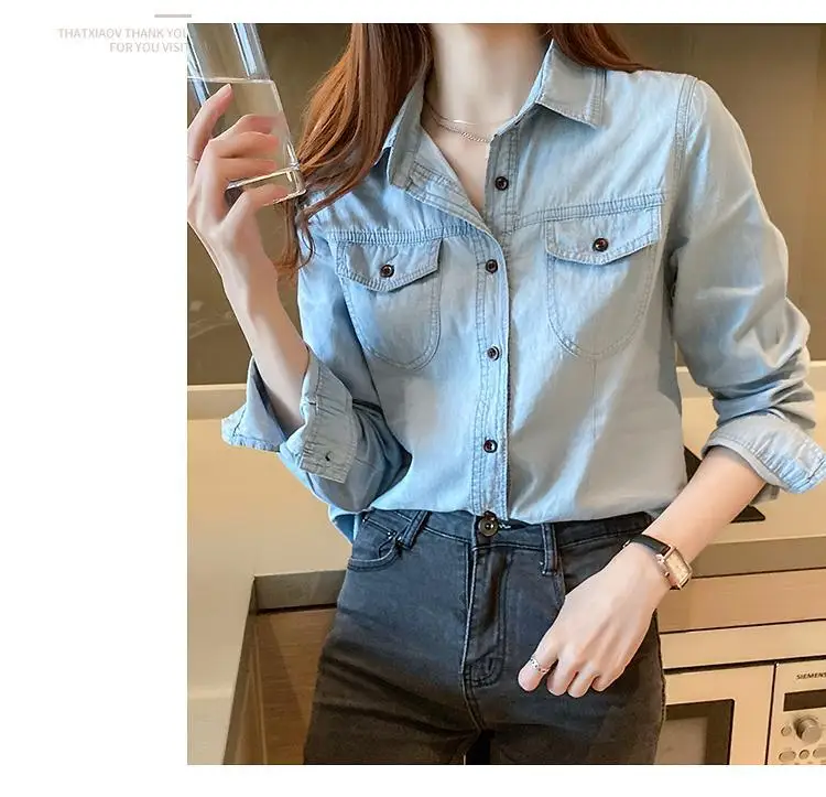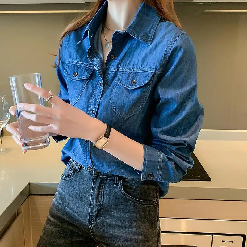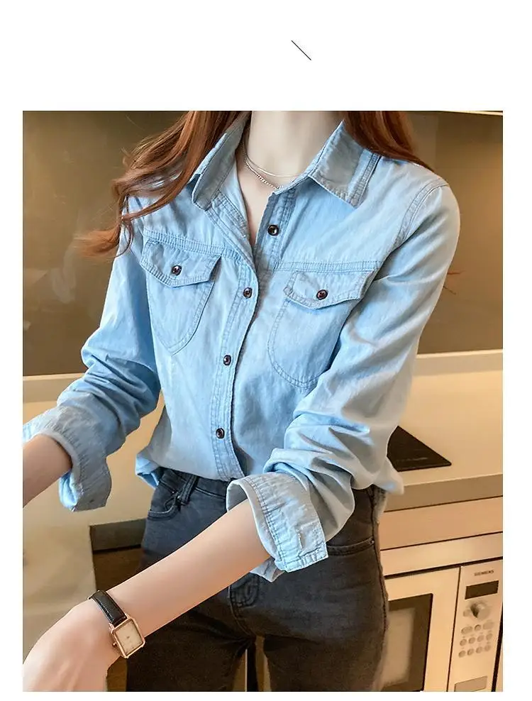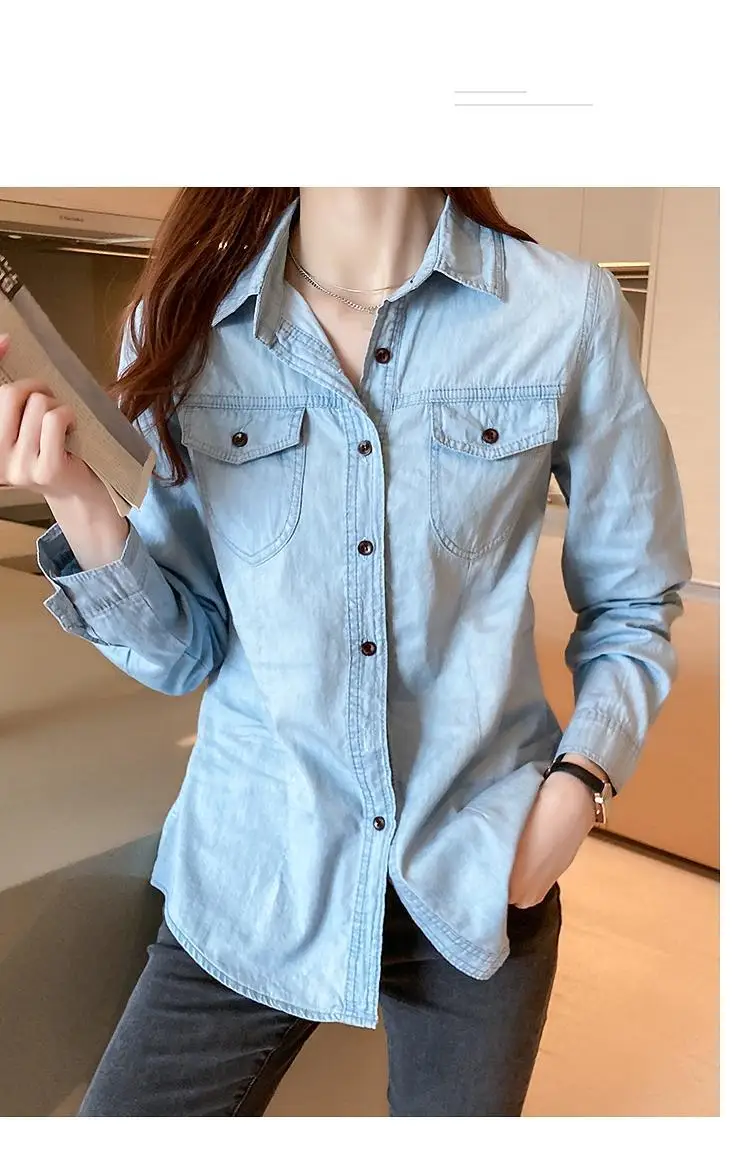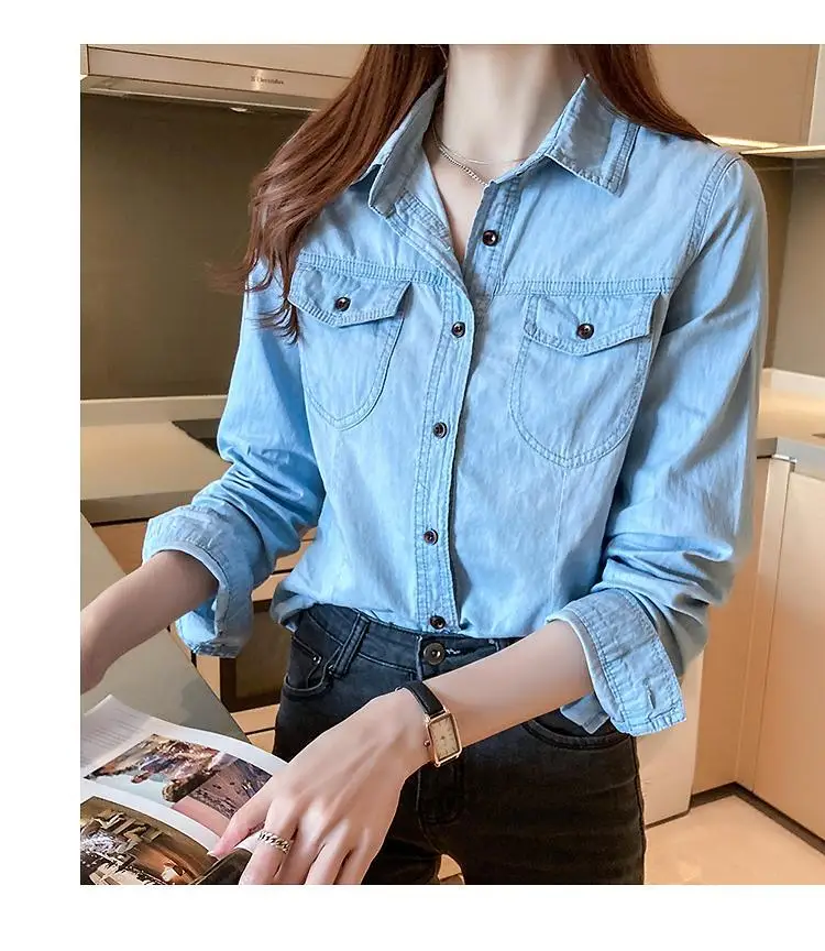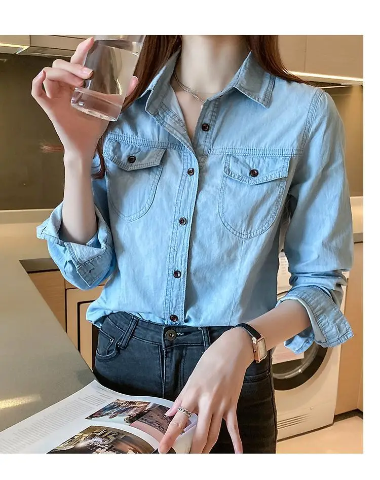 Women's Light Blue Denim Long Sleeve Button-Down Casual Shirt with Pockets