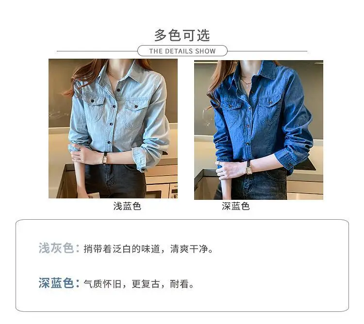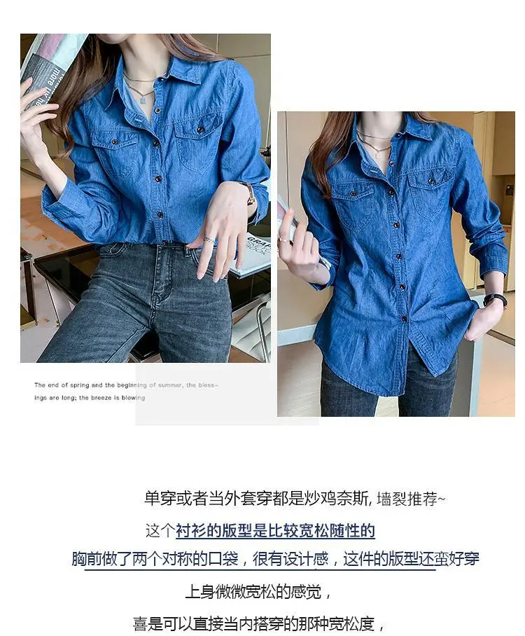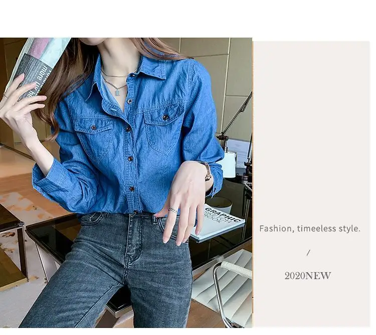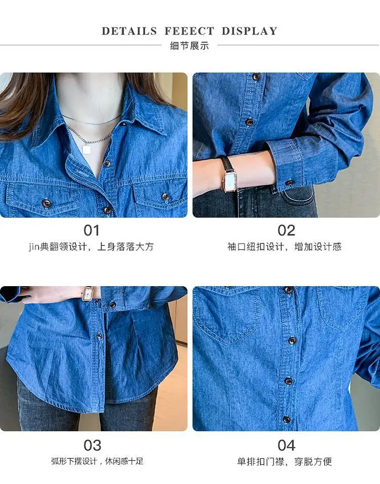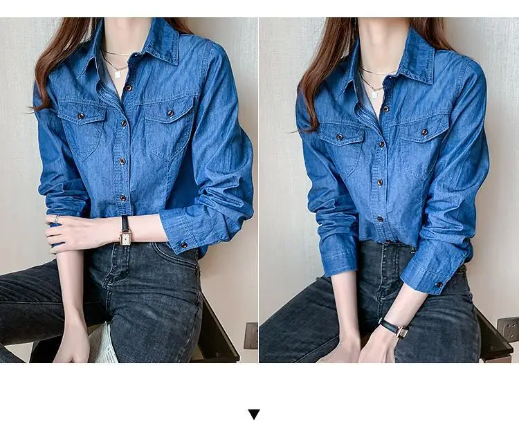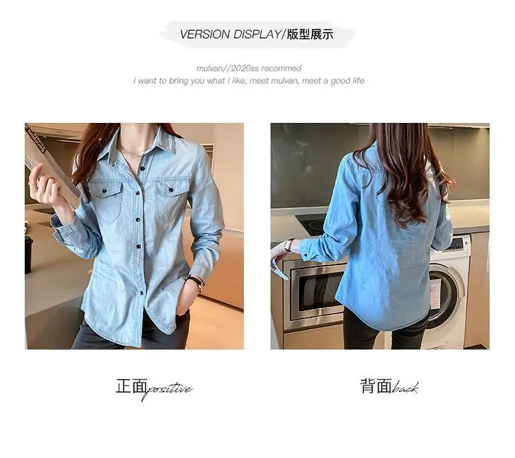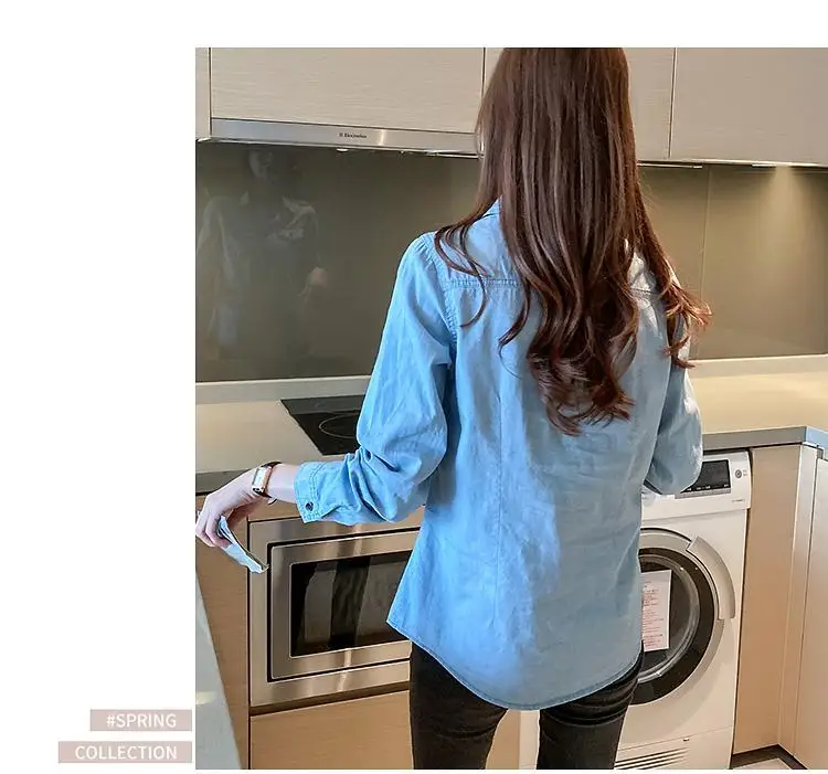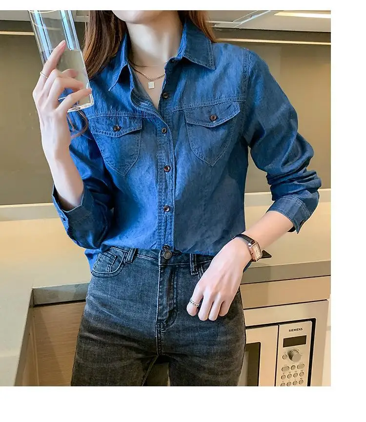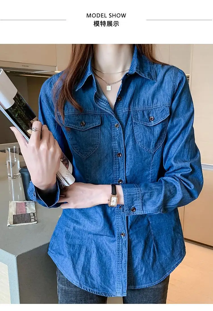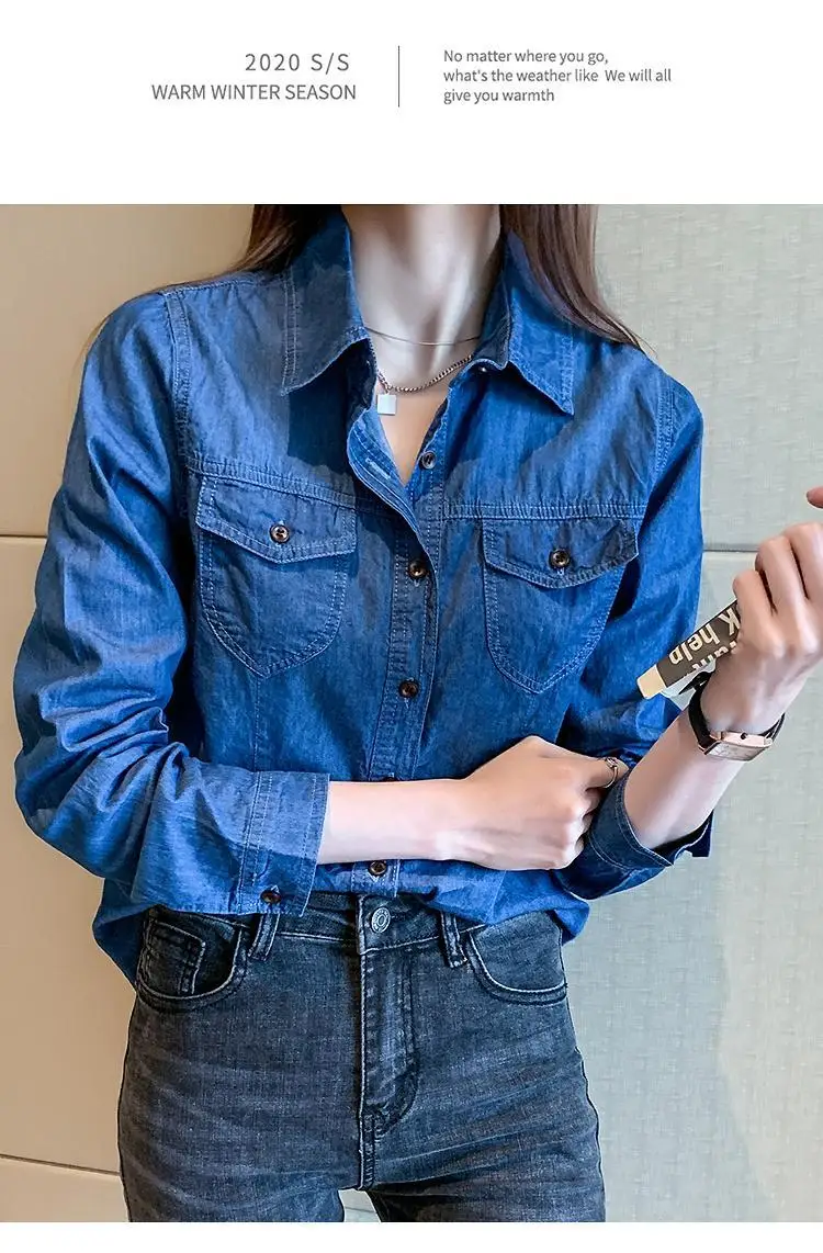 Women's Light Blue Denim Long Sleeve Button-Down Casual Shirt with Pockets